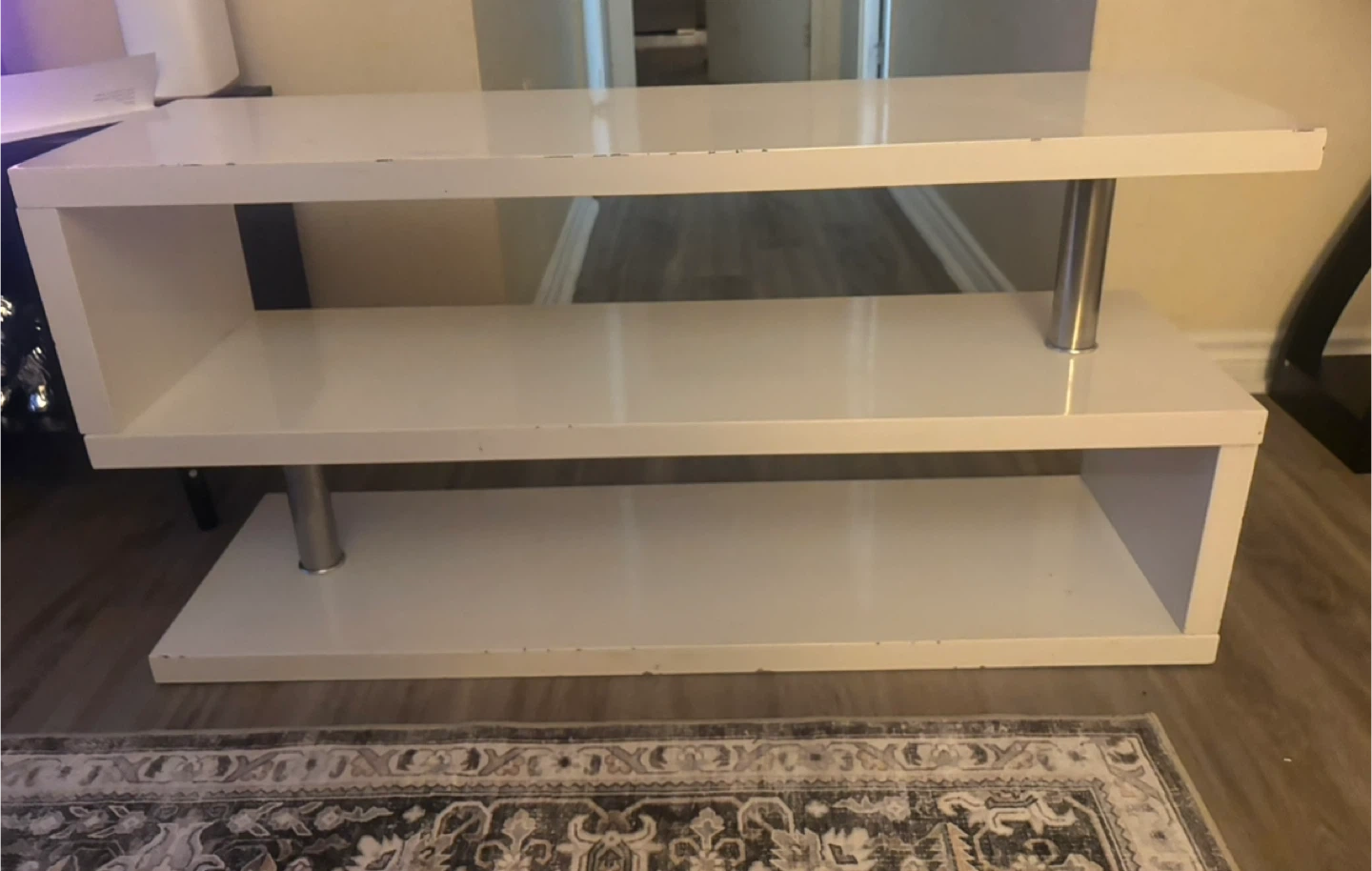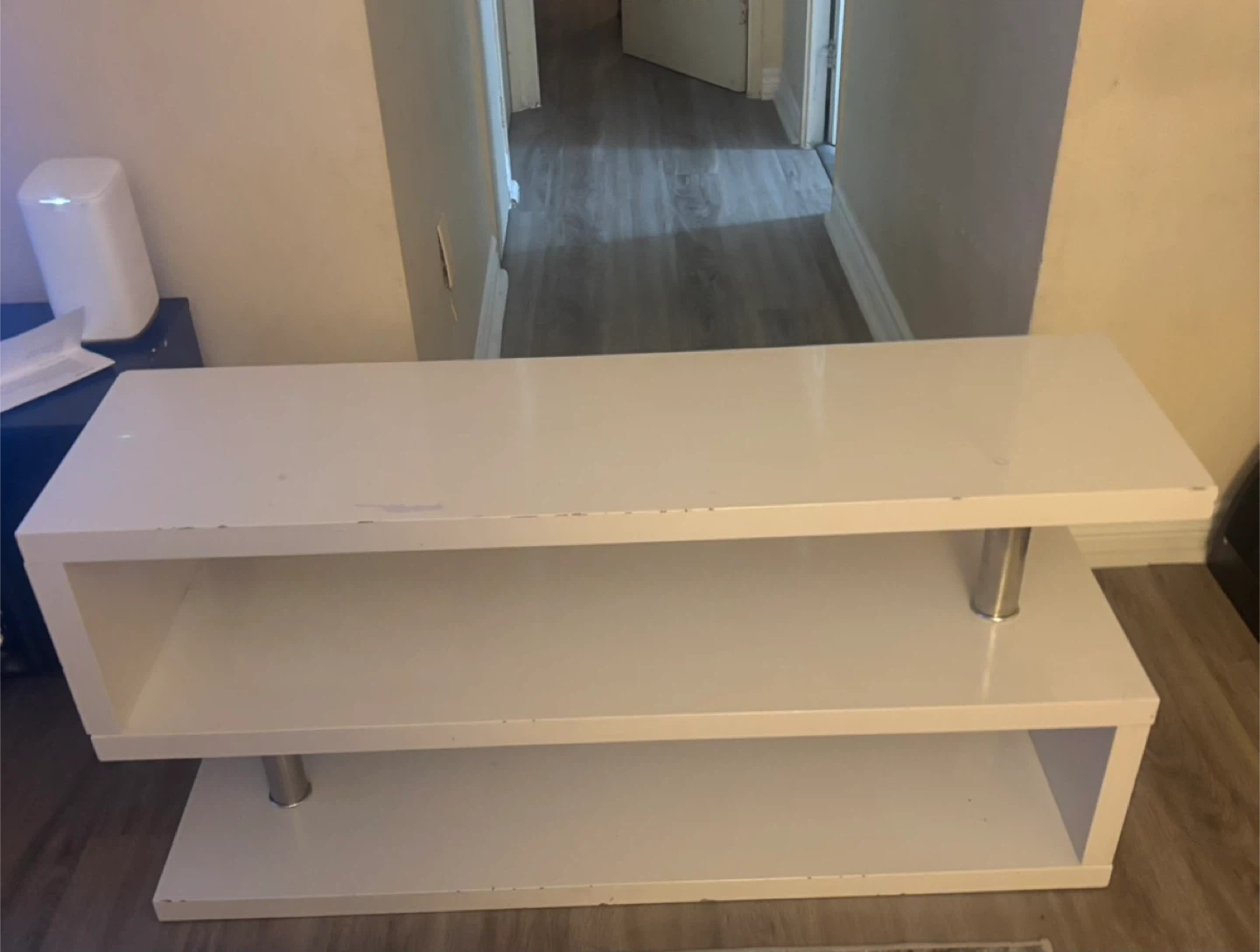 Selling a white TV stand. It has a modern design with two shelves, perfect for storing your media devices or displaying decor. There are some minor signs of wear, but overall it's in good condition and ready for a new home!