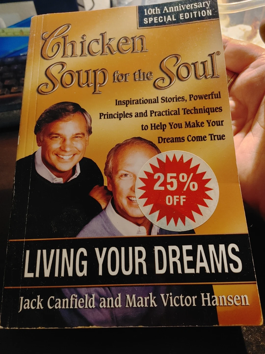 Selling a copy of 'Chicken Soup for the Soul: Living Your Dreams' by Jack Canfield and Mark Victor Hansen. This is the 10th Anniversary Special Edition, filled with inspirational stories, powerful principles, and practical techniques to help you make your dreams come true! A great read for anyone looking for a little motivation and guidance