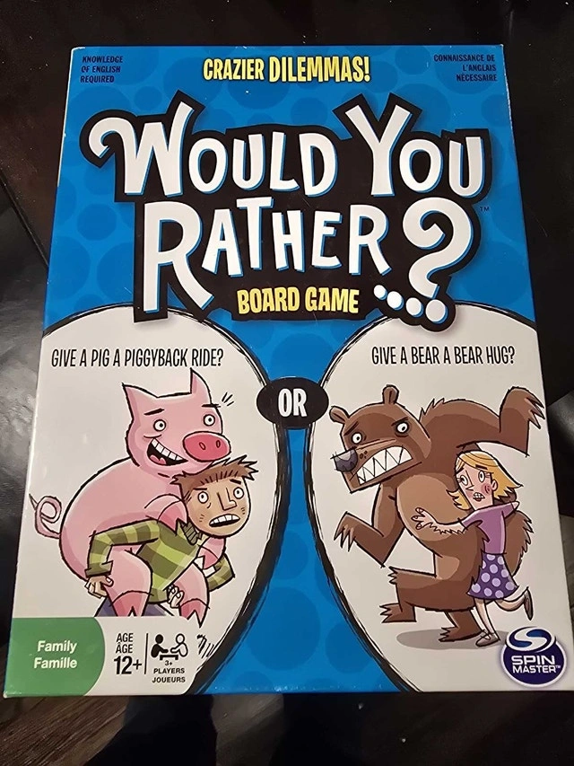 Spice up game night with the Spin Master Would You Rather board game, perfect for family fun with 3+ players and ages 12 and up! This pre-owned game is in great condition and promises hours of laughter as you navigate through a series of crazy dilemmas.