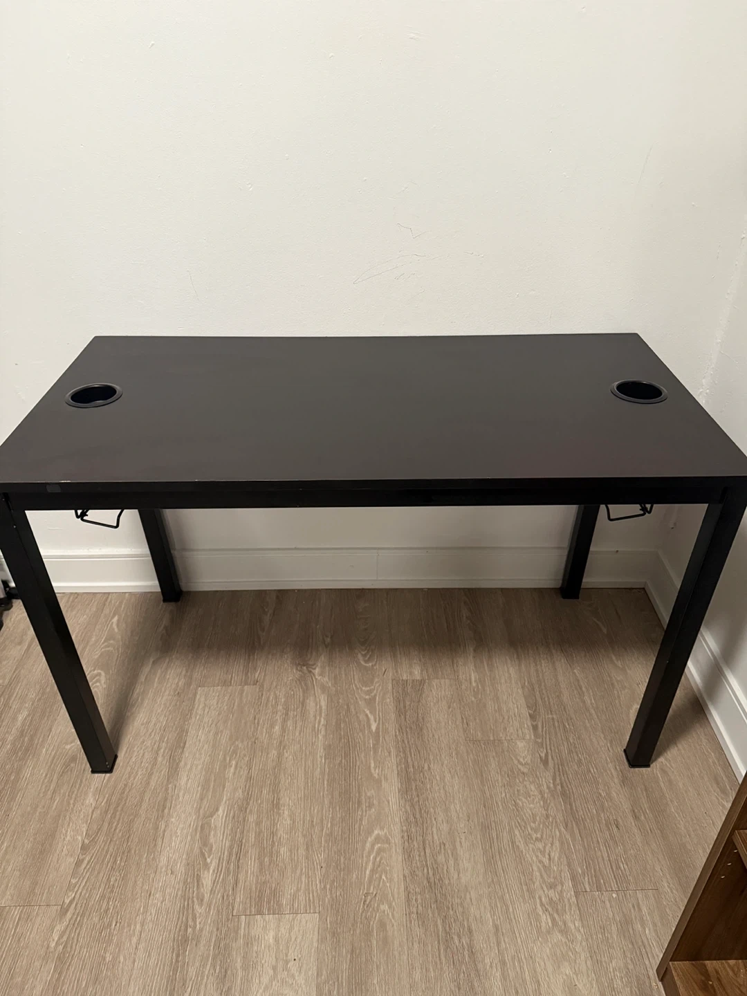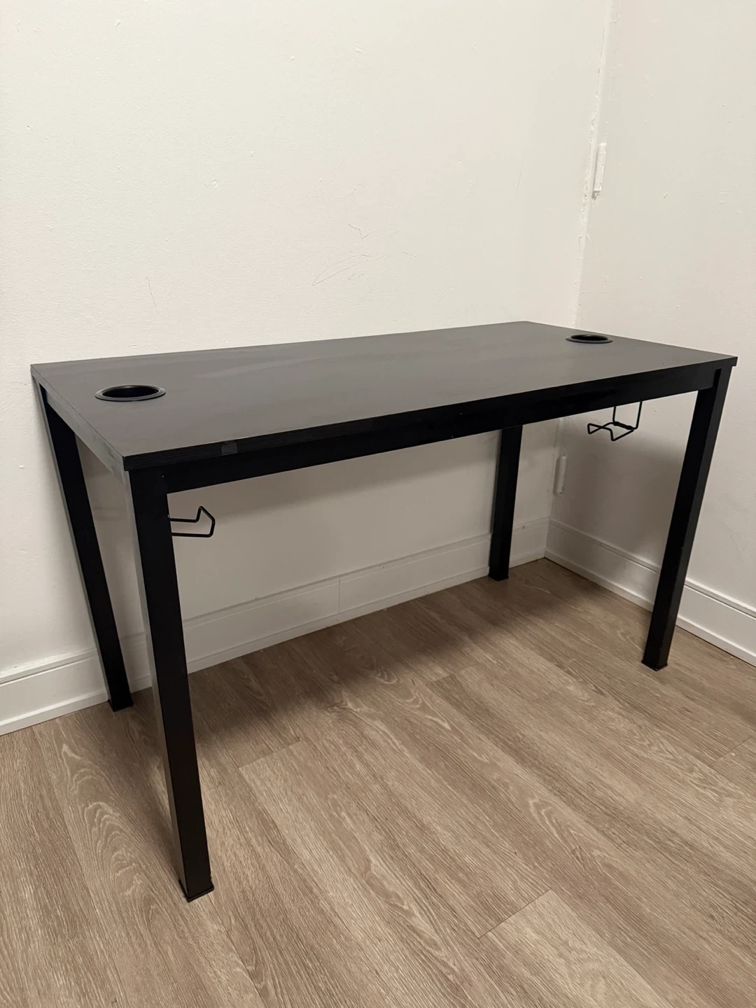 Lightweight black desk with 2 headphone holders underneath and 2 cup holders on either side. Wood on top with steel frame and steel legs. Versatile, can be used as a desk or table.