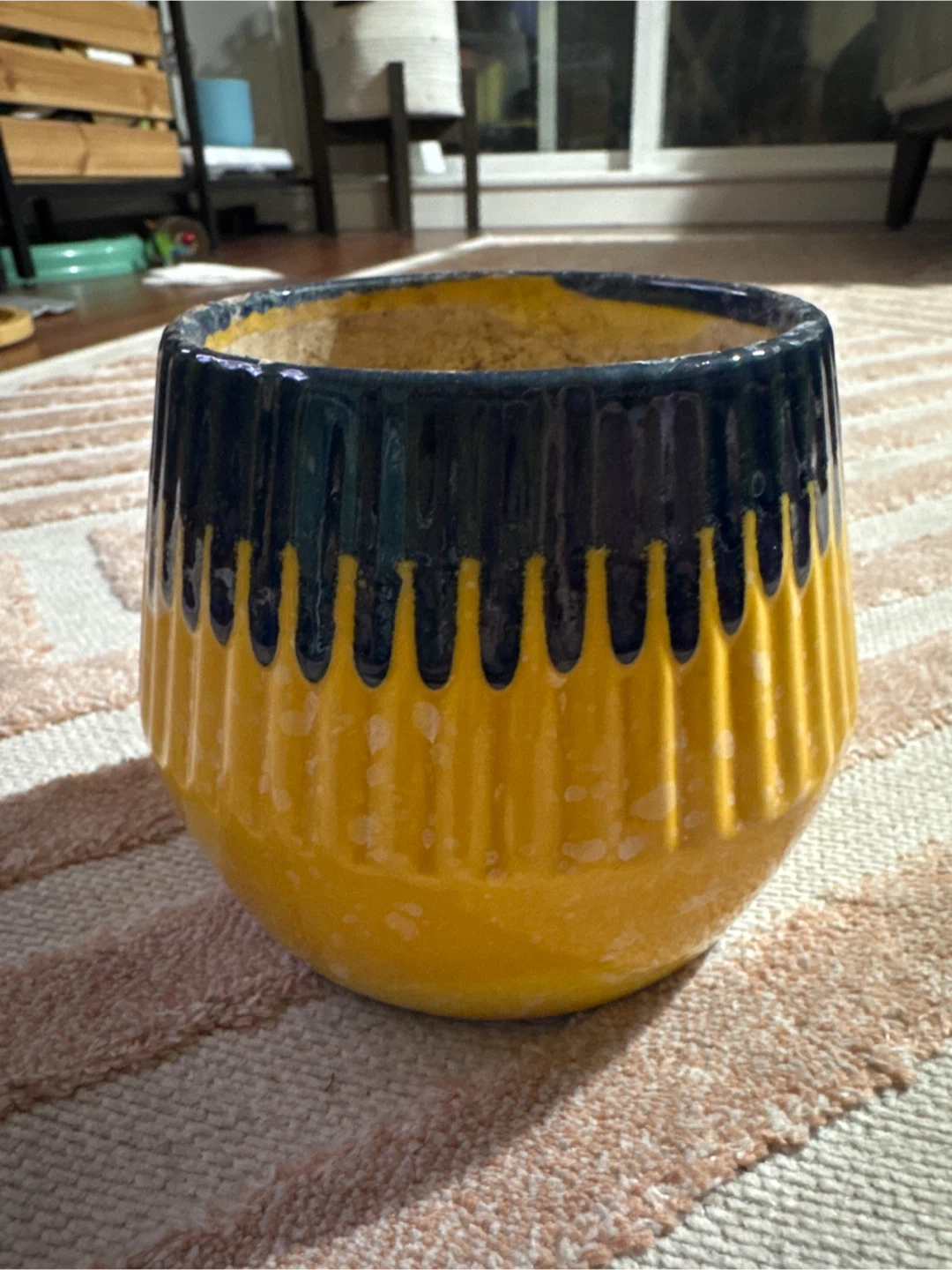 Selling a cute ceramic plant pot! It features a vibrant yellow body with a stylish blue top. Perfect for adding a pop of colour to your home or garden