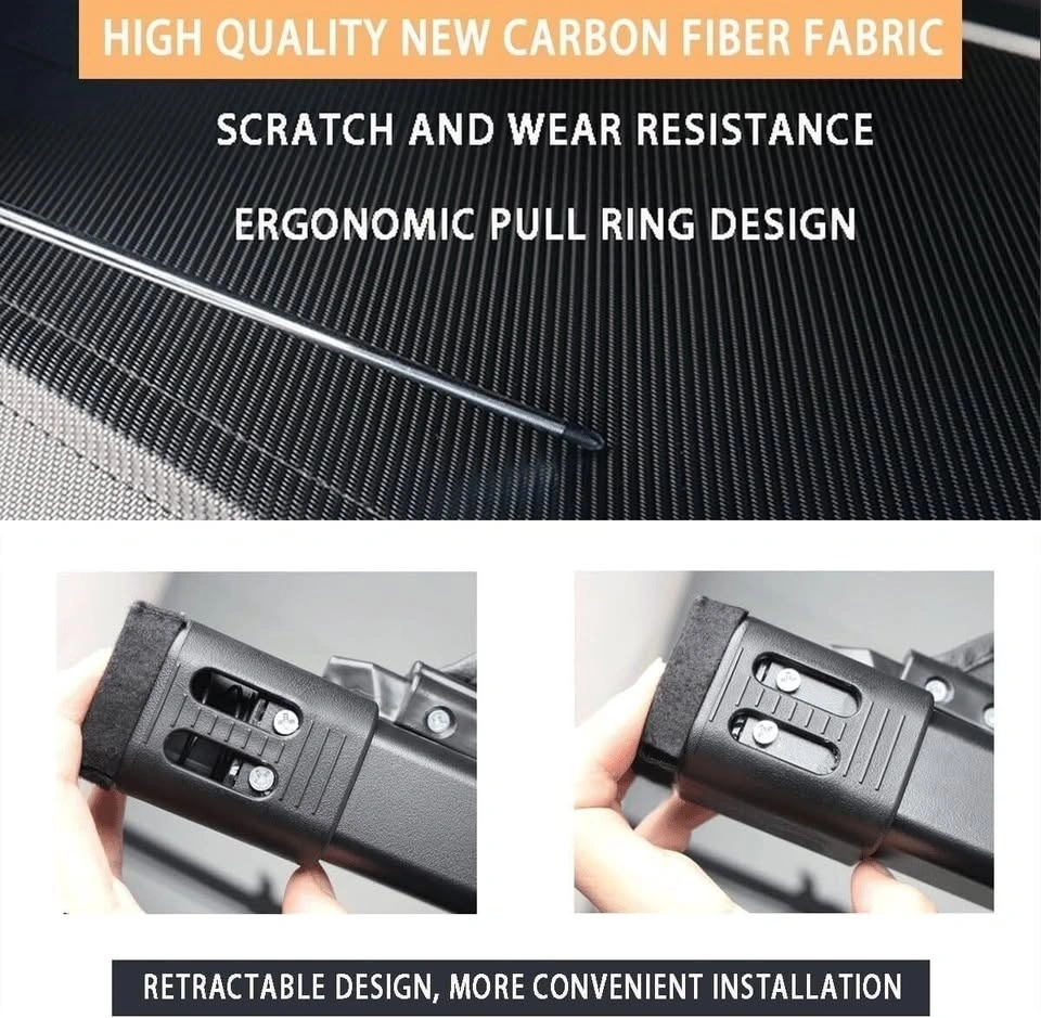 New high-tech fabric carbon fiber texture, high density, tear resistance, wear-resistant, waterproof, no leakage, easy to clean, more durable. Thickened aluminum alloy bracket, strengthen the structure, super load-bearing, not easy to deformation and fracture, no rust. No drilling design, directly in accordance with the original model reserved slot installation, spring end retractable, to minimize noise, impact and damage, to maximize the firmness.
