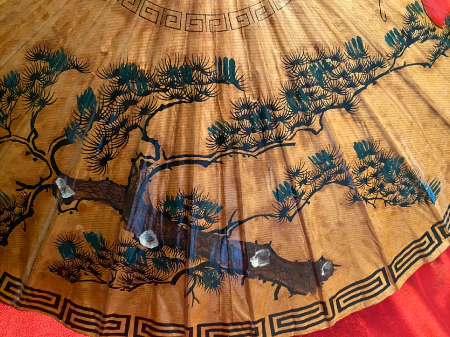Selling a vintage Japanese parasol featuring a beautiful crane and pine tree design. It's a unique piece that would add a touch of elegance to any room. The parasol has a wooden handle and a decorative border. Perfect for collectors or anyone who appreciates vintage decor