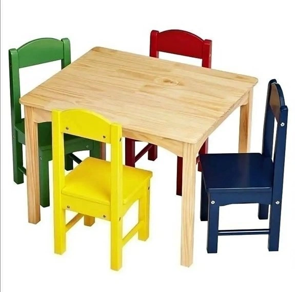 Brighten up your child's playtime with this brand-new kids' table and chair set, featuring a sturdy natural wood table and four colourful chairs!