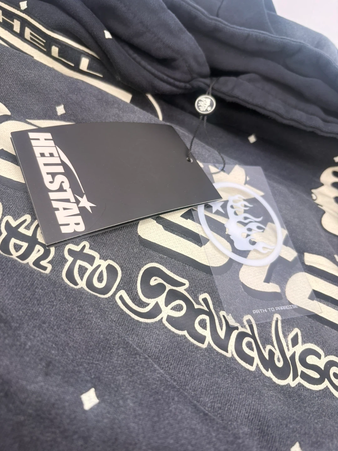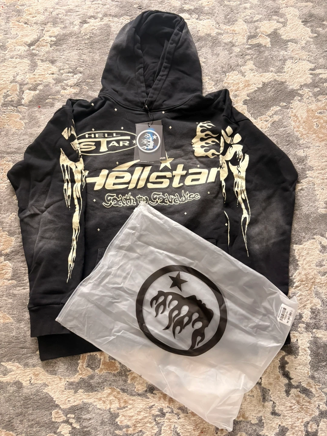 Selling a Hellstar 'Faith to Paradise' hoodie in black. It features a unique design with the brand's logo and graphics on the front and back. Comes with the original tag and packaging! NFC scans!!!