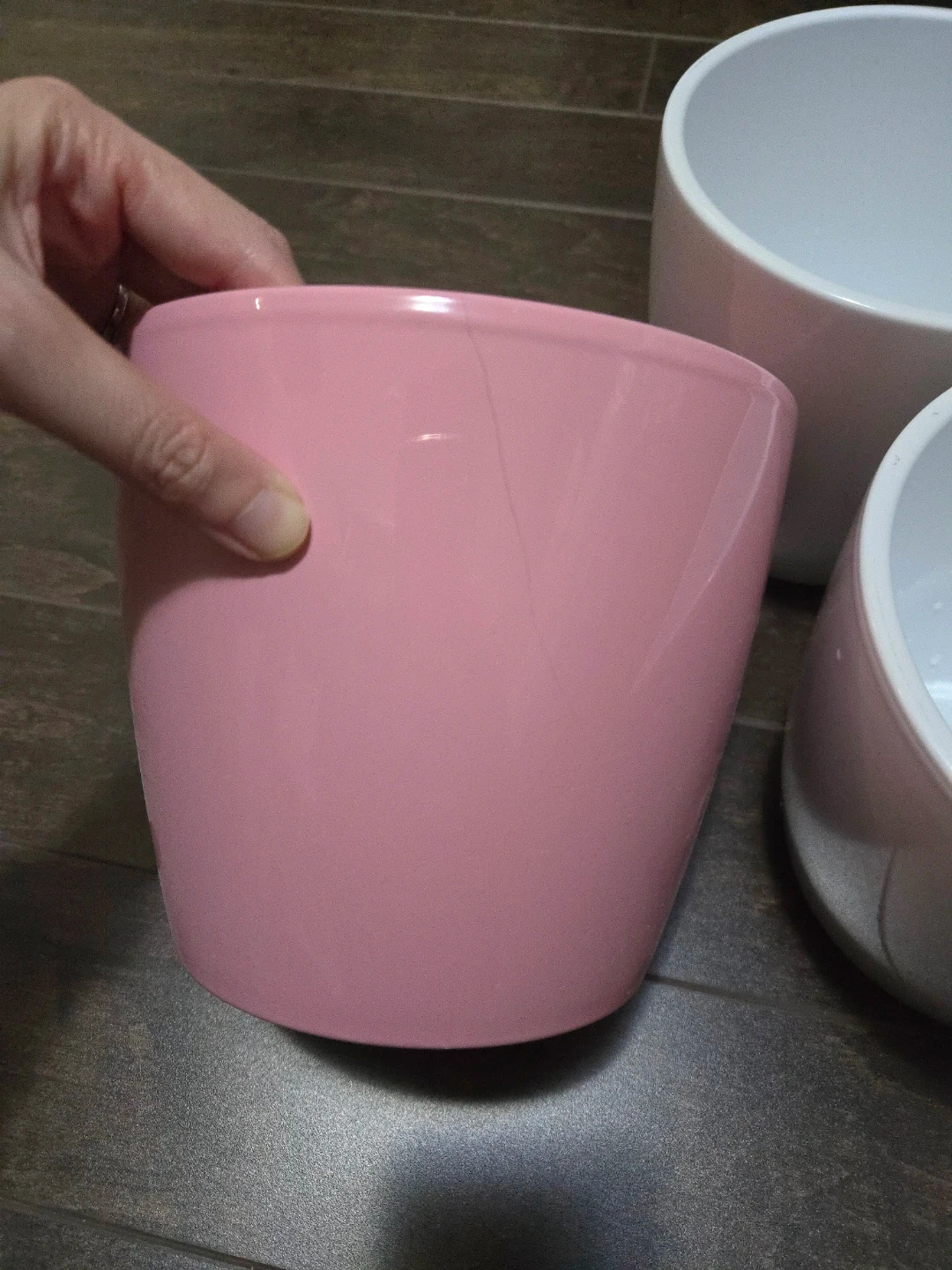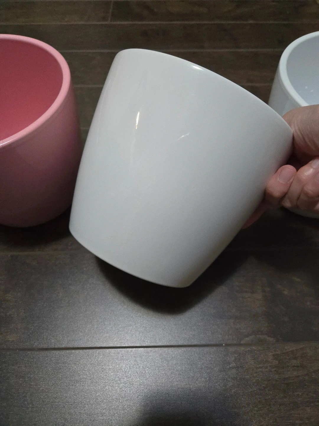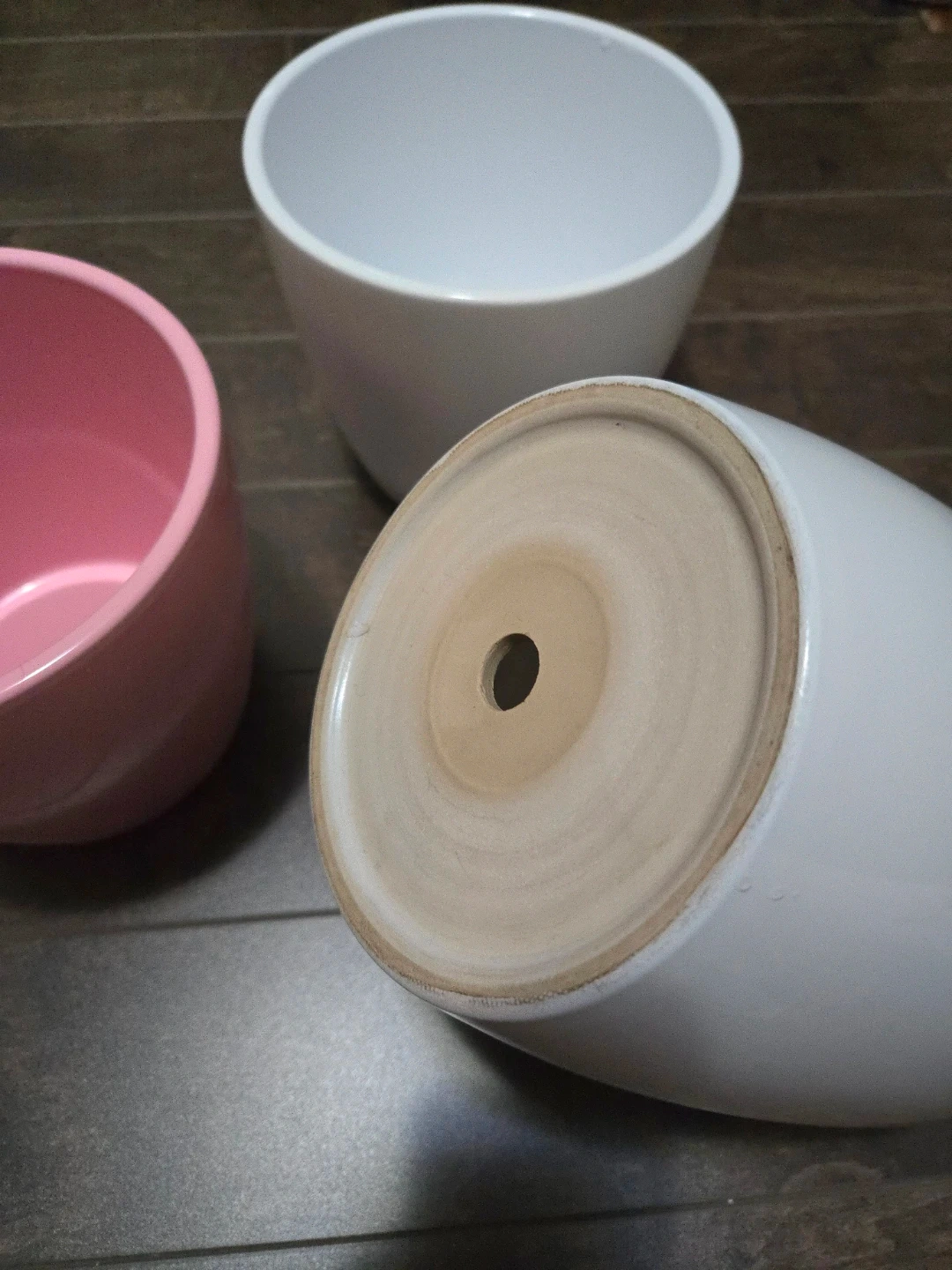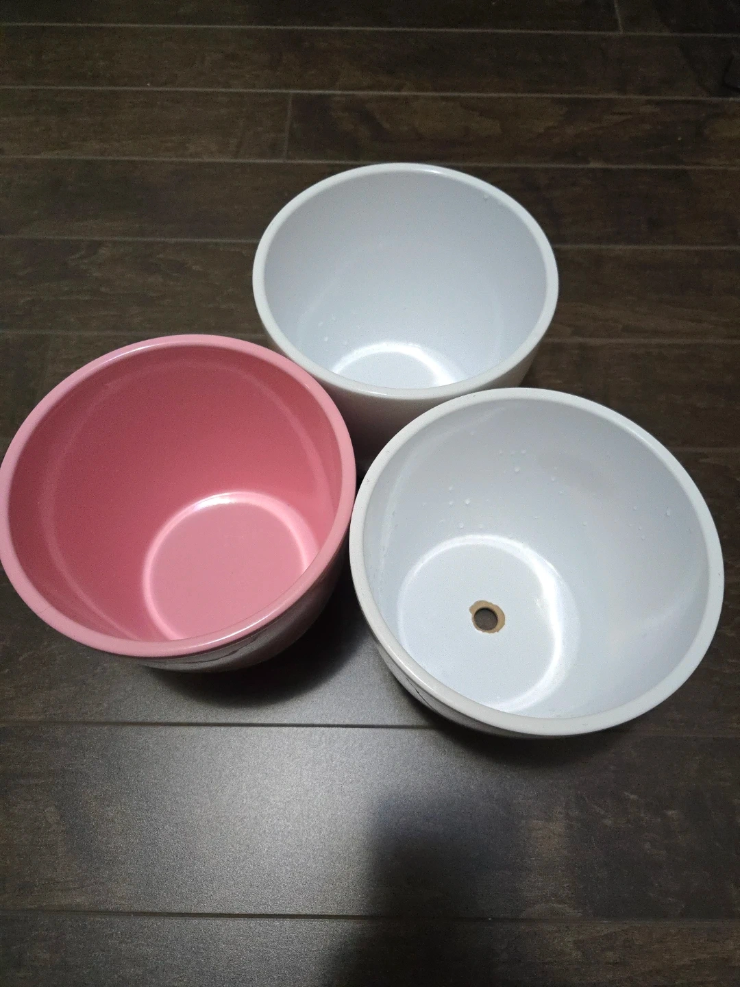 The two white ones have been used. One of the pot has a drainage hole. Another has used for cover pot.