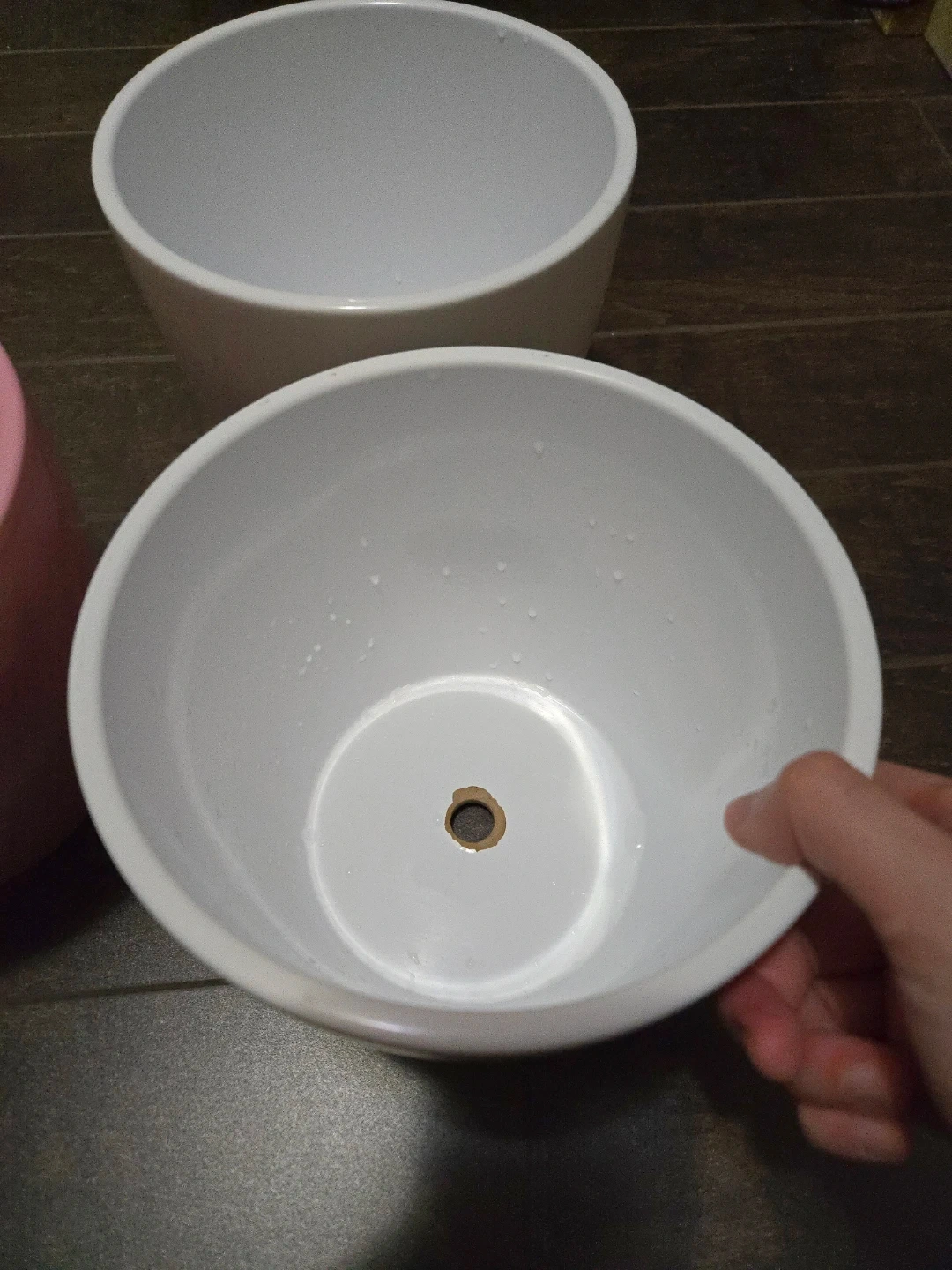The two white ones have been used. One of the pot has a drainage hole. Another has used for cover pot.