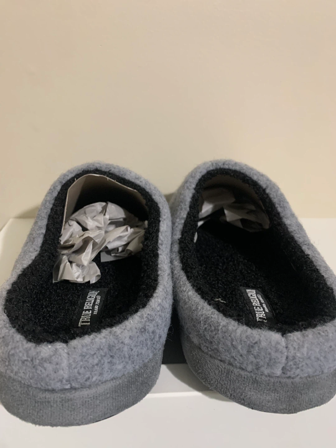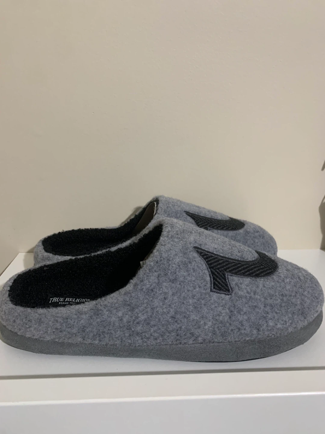 Cozy up with these True Religion slippers! They're a stylish grey colour and size 10. Perfect for keeping your feet warm around the house