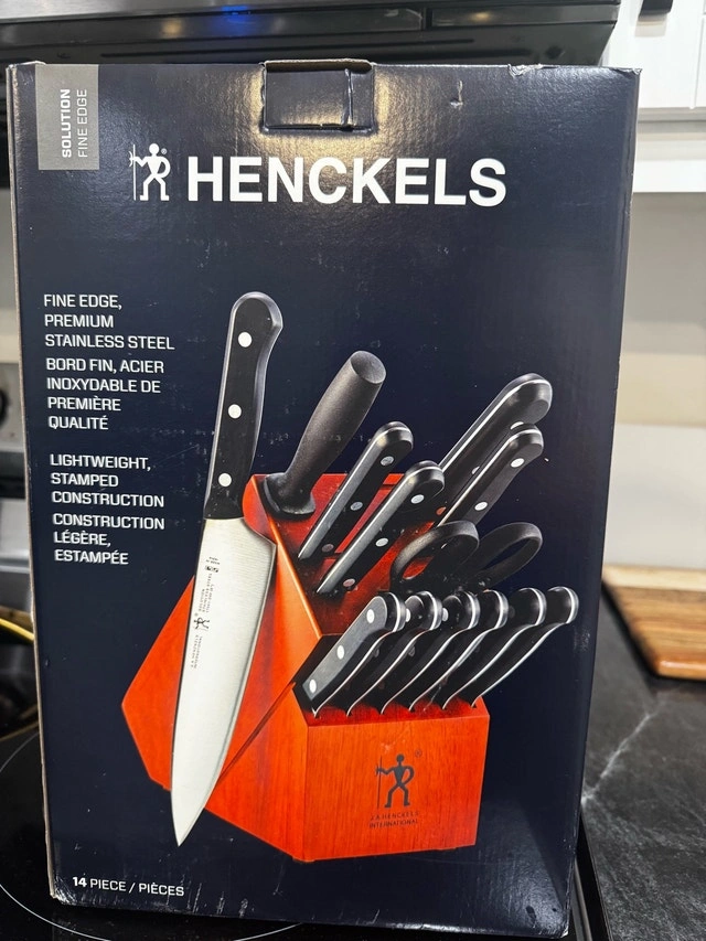 I'm selling a brand new Henckels 14 piece knife set, featuring fine edge, premium stainless steel blades and ergonomic, triple-riveted handles for precision cutting. This set includes a variety of knives for all your kitchen needs, neatly organized in a stylish knife block. Set Contents: * Paring Knife * Utility Knife * Chef's Knife * Bread Knife * Santoku Knife * Sharpening Steel * Kitchen Shears * Steak Knives (6) * Knife Block