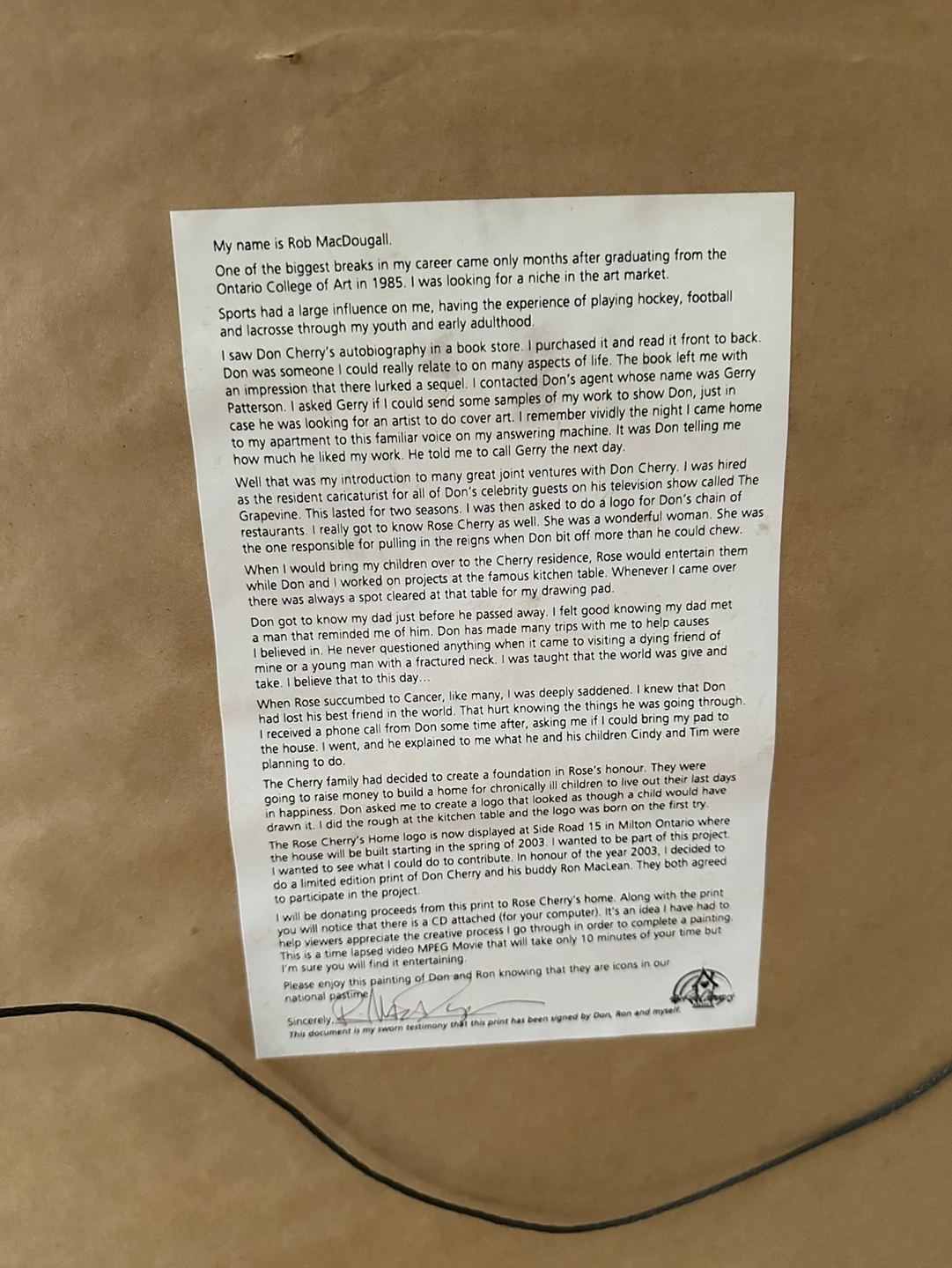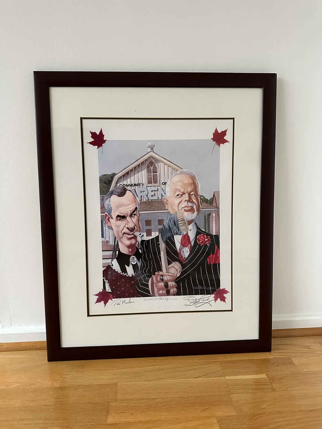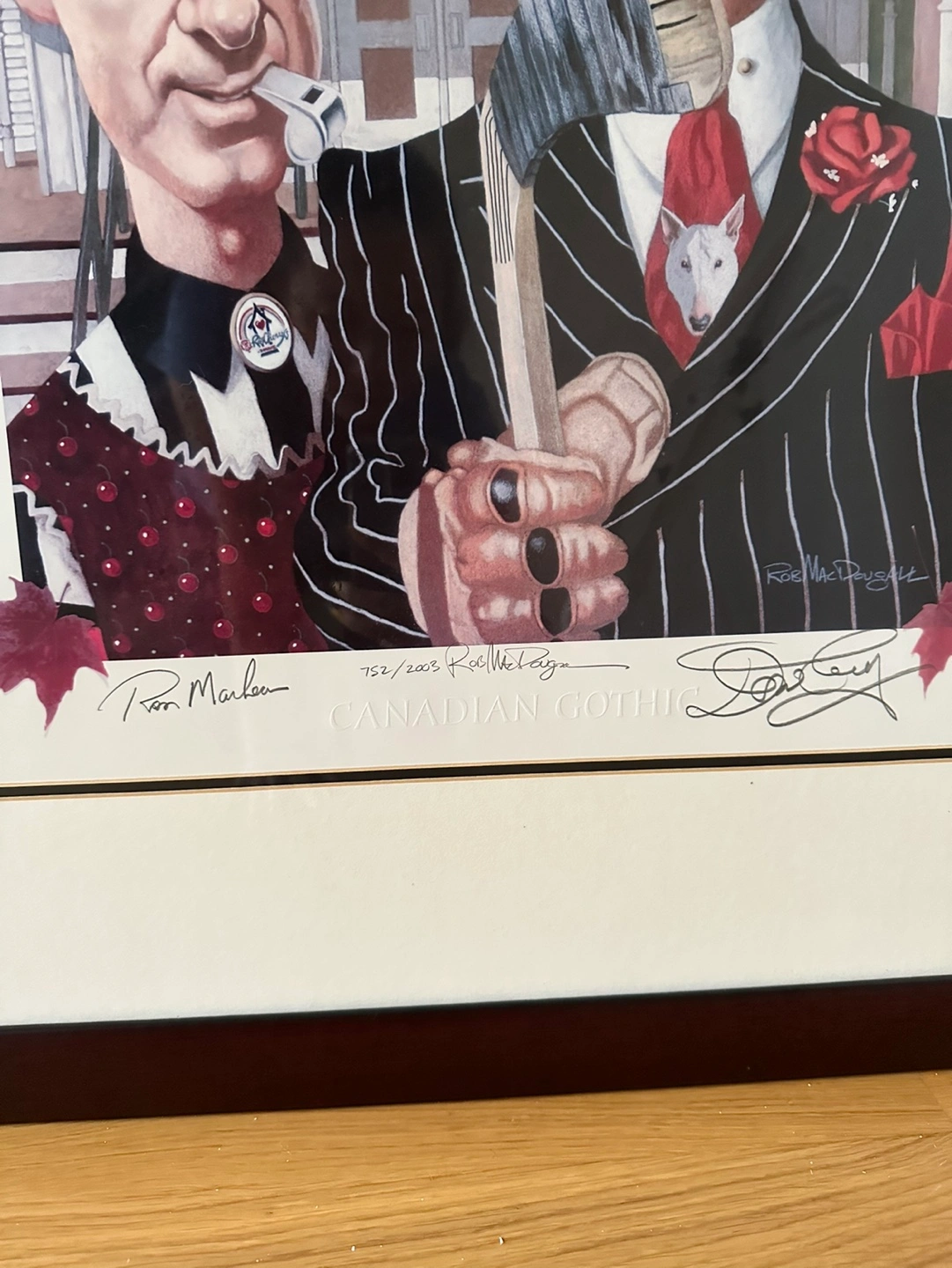 This limited-edition print entitled 'Canadian Gothic' features hockey icons - Ron MacLean & Don Cherry. Based off the classic painting 'American Gothic', it displays caricatures of the pair and has been signed by both beautifully at the bottom. The framed display measures to 27X33" in size and has been signed by artist Rob MacDougall as well as been numbered 752/2003 at the bottom. Great piece.