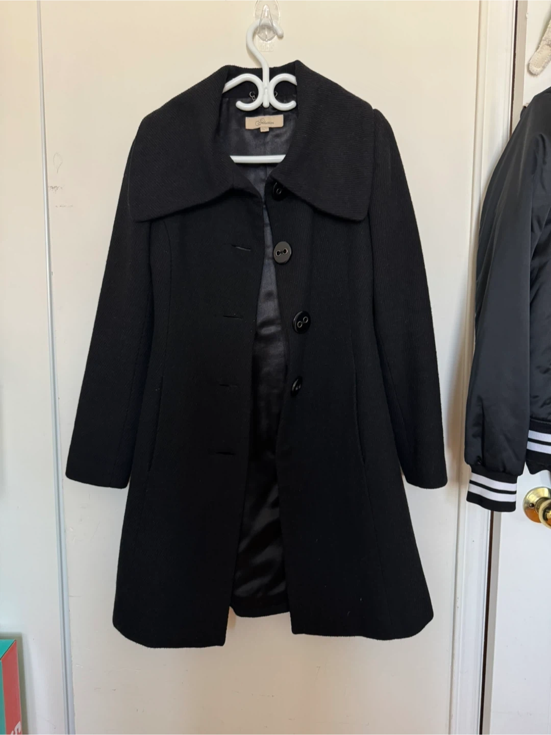 Elegant black coat with a structured fit and wide collar. Fully lined and in good condition.