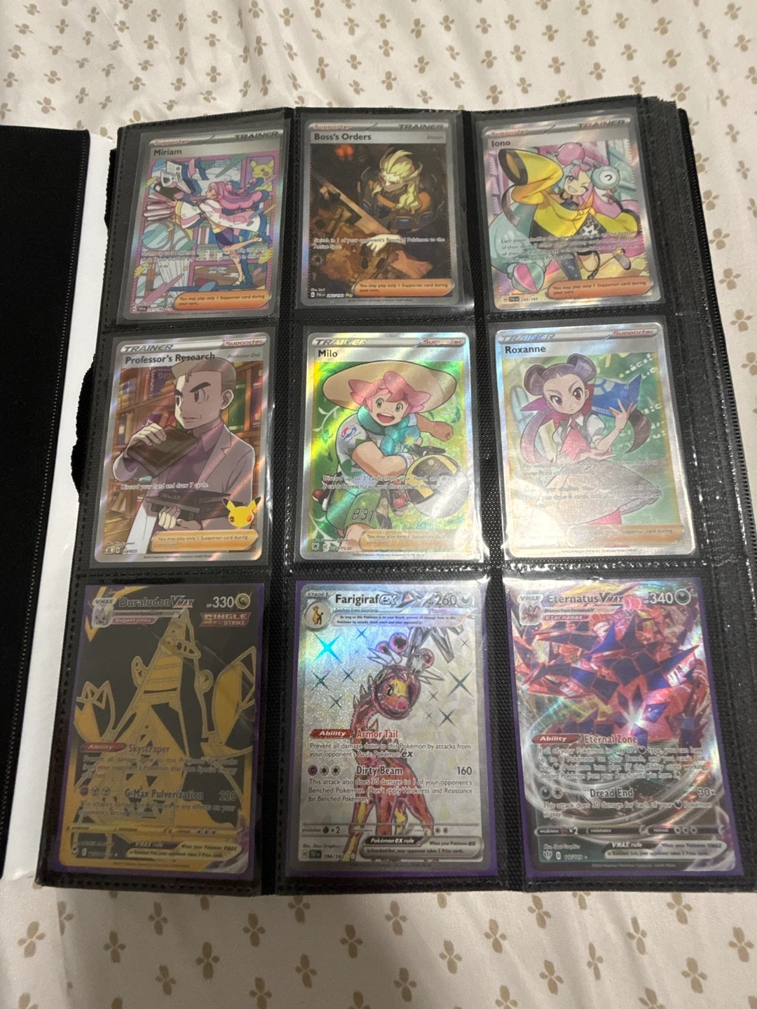 Selling a collection of Pokémon Trainer cards, including Miriam, Boss's Orders, and Iono. These cards are in great condition and ready to add to your collection! Also includes Professor's Research, Milo, Roxanne, Duraludon VMAX, Farigiraf EX, and Eternatus VMAX