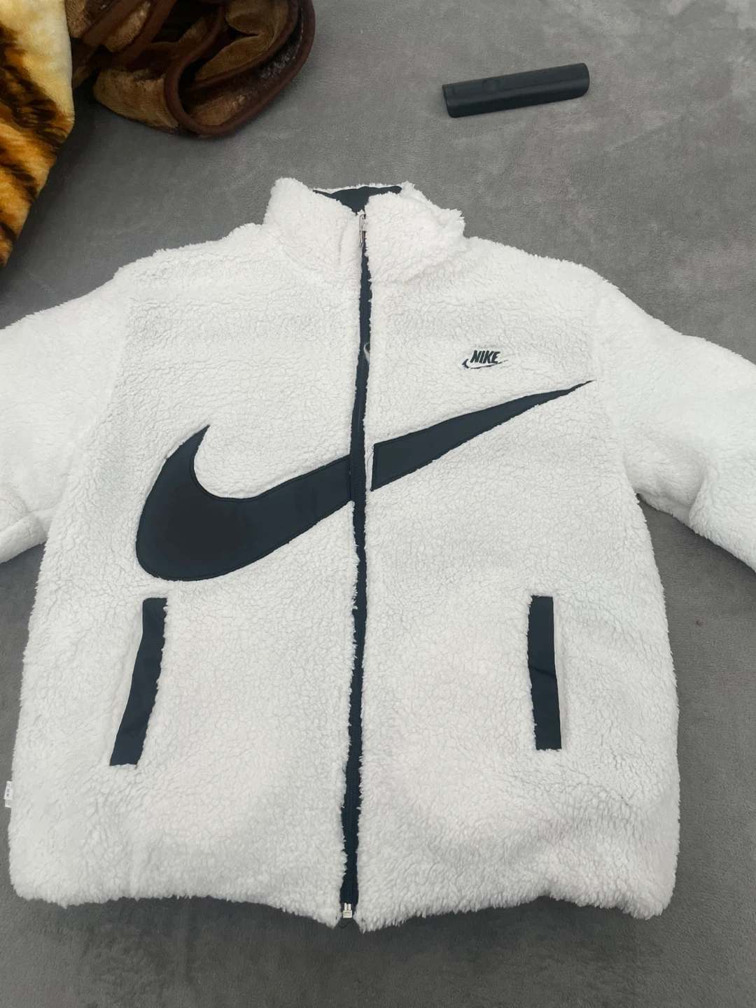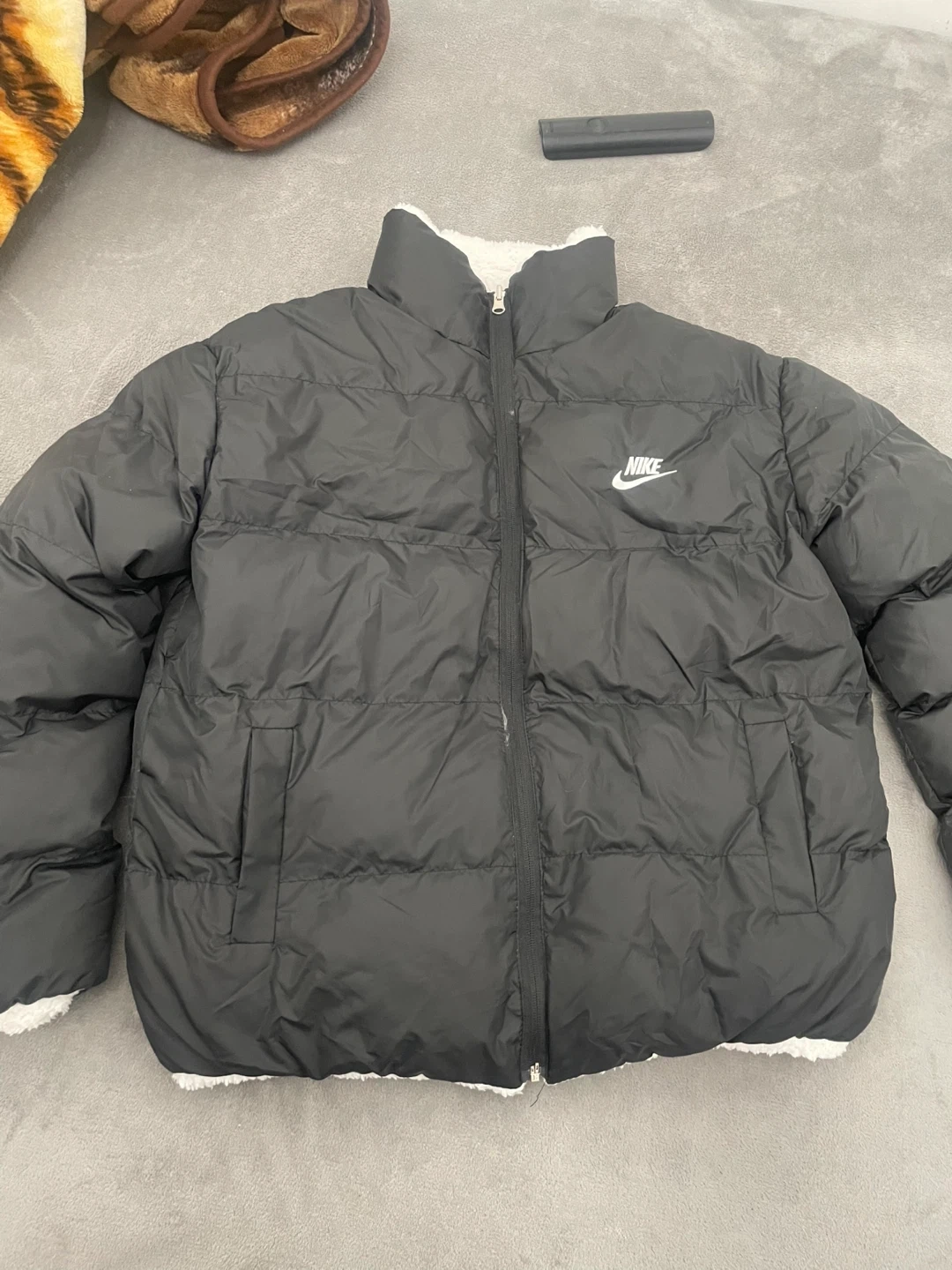 Selling a Nike reversible puffer jacket! It features a cozy sherpa fleece on one side and a classic puffer design on the other. The jacket has the Nike logo on both sides. Great for staying warm and stylish!