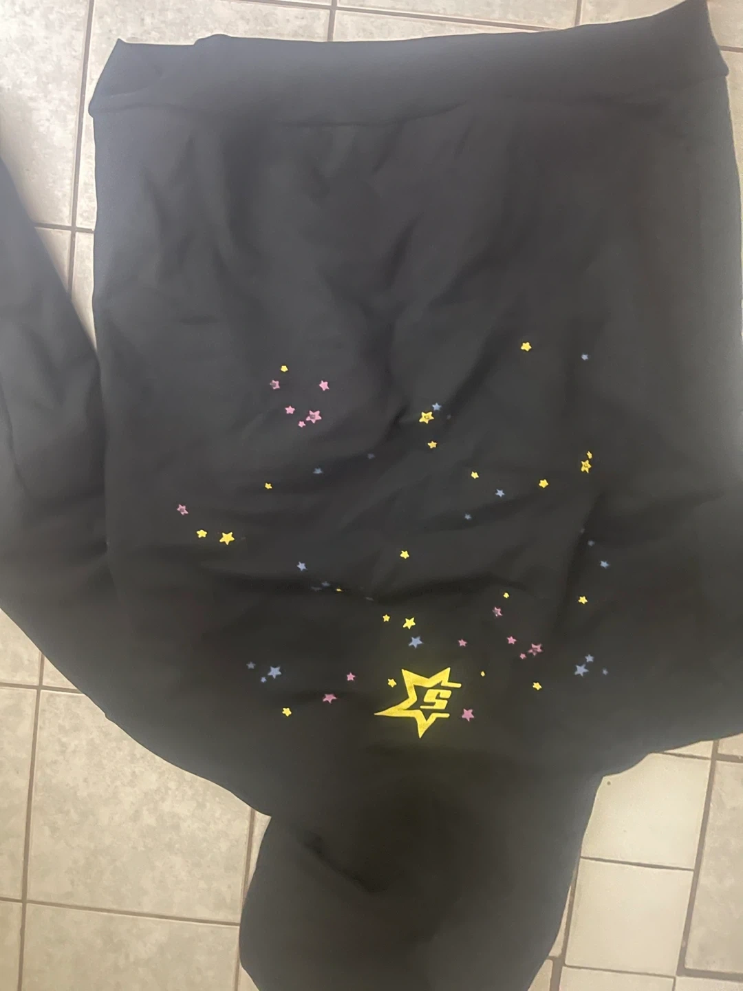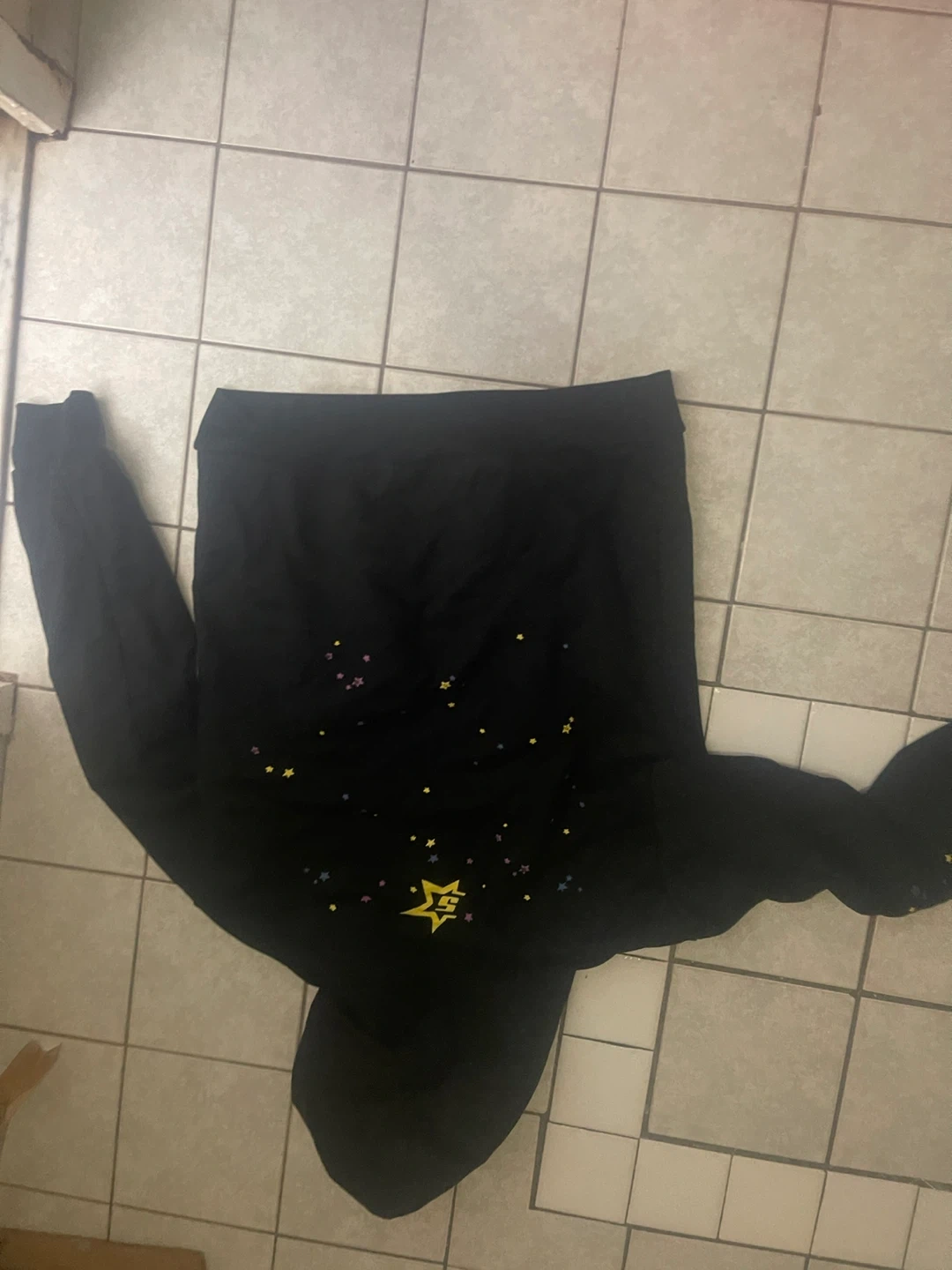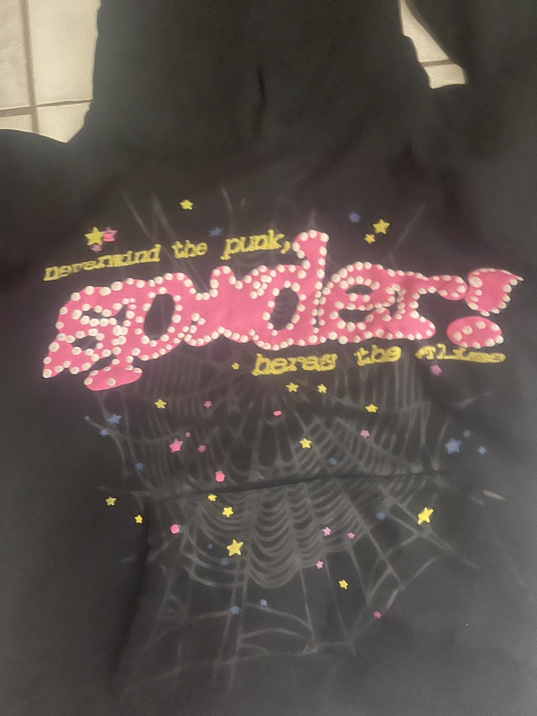 Selling a black Sp5der hoodie in size small. It features a unique design with stars and a spiderweb. The hoodie is in good condition and perfect for adding a stylish touch to your wardrobe! Pick up only