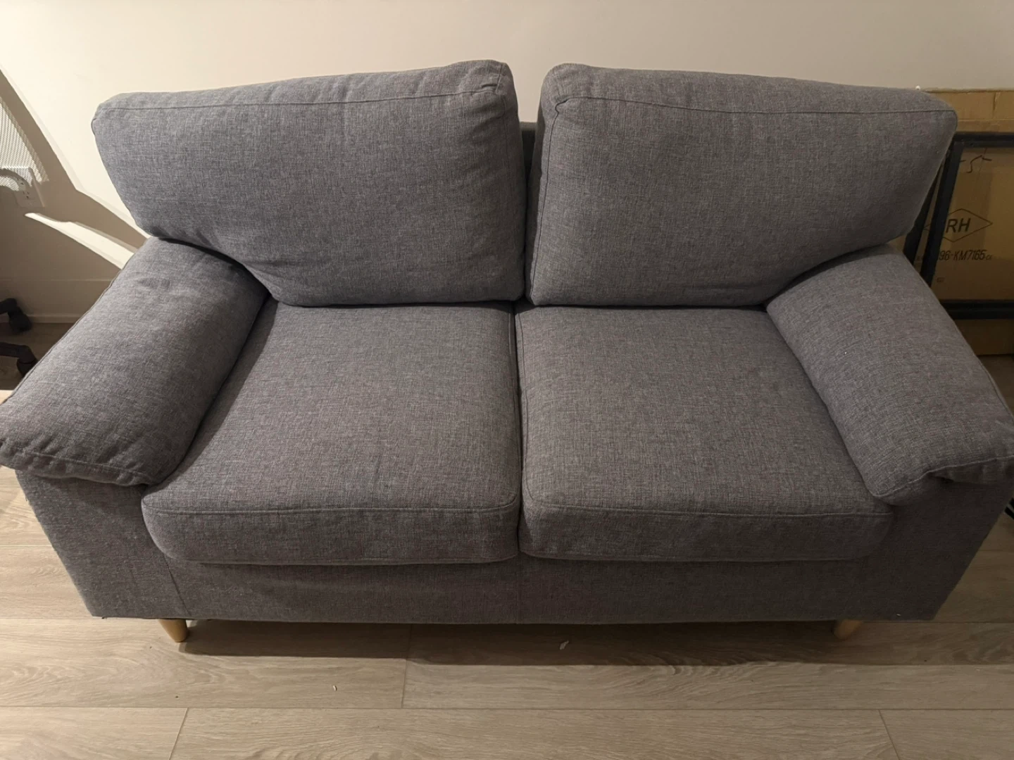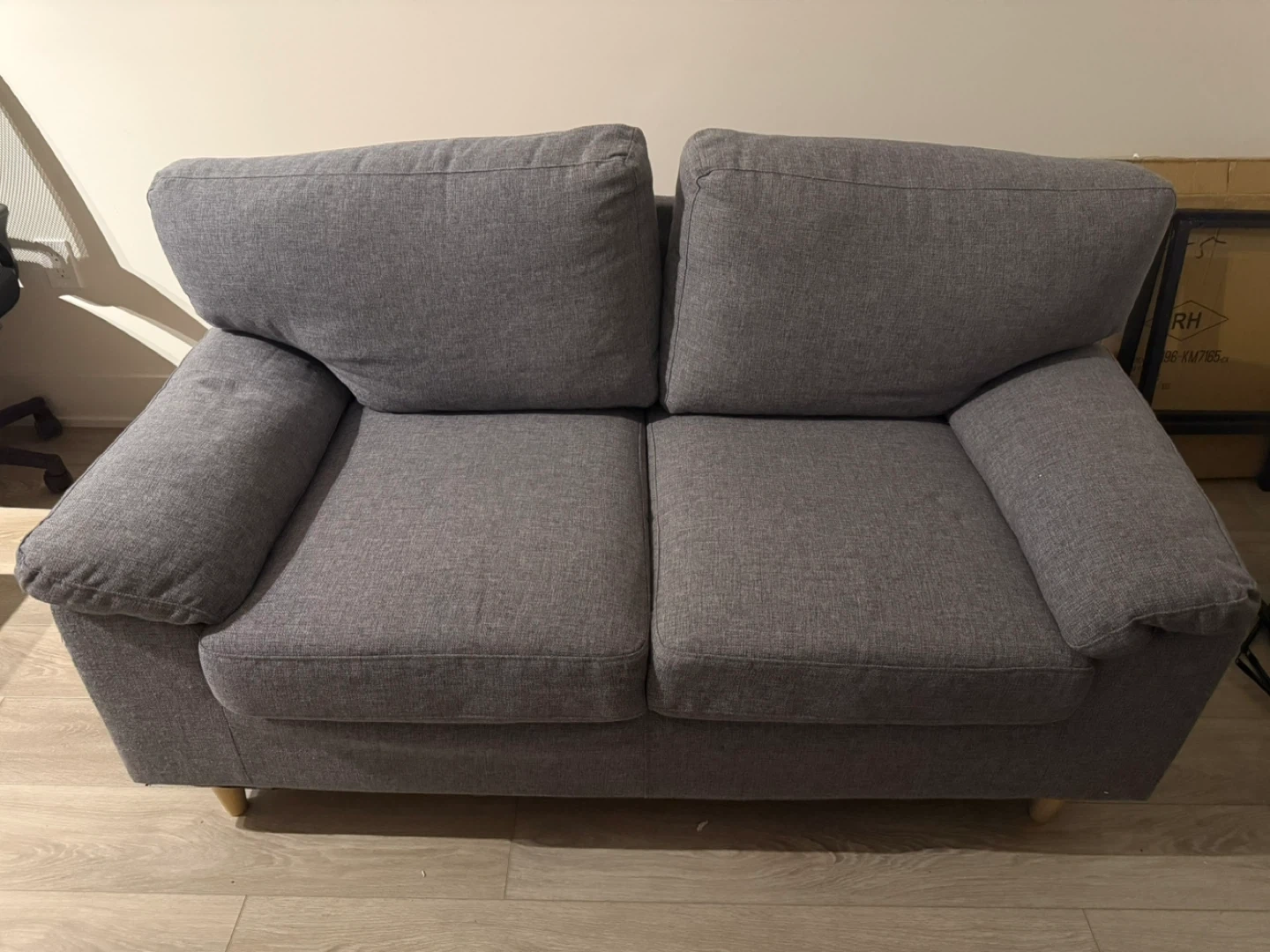 Selling a comfy grey loveseat sofa! It's in great condition and would be perfect for a small space or apartment. The cushions are nice and soft, making it a cozy spot to relax after a long day. It's a great addition to any living room!