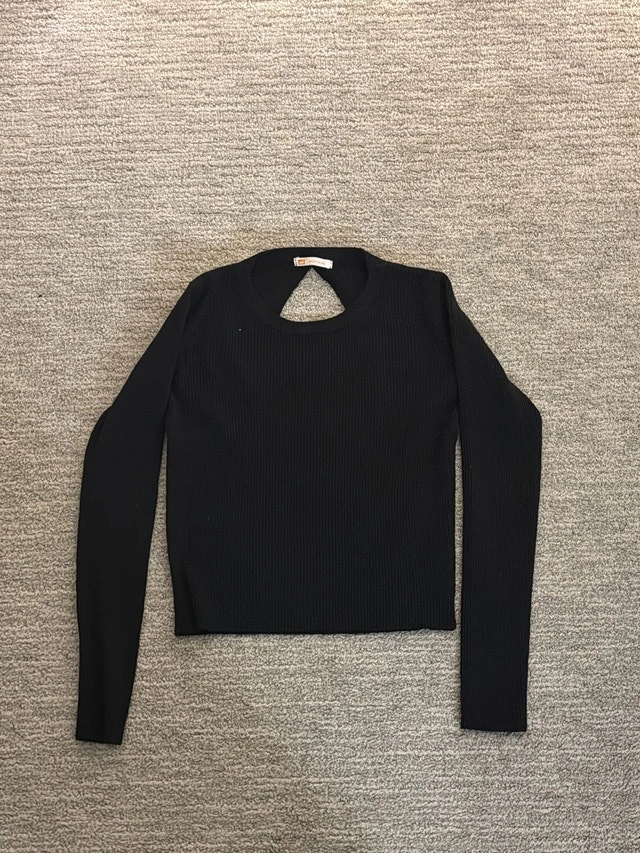This is a black TNA sweater that features a stylish open back. It is in used-good condition, showing minimal signs of wear. A versatile and chic addition to any wardrobe, perfect for layering or wearing on its own.