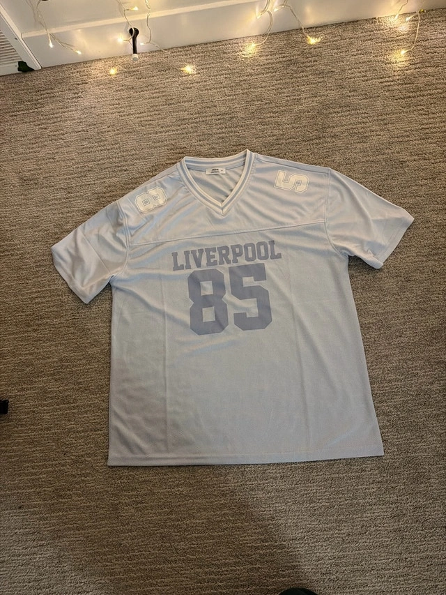 Show off your support for Liverpool with this light blue jersey, size large. This item is in used condition, ready for a new fan to wear with pride. It's ready to find a new home! I'm decluttering my closet and hoping someone else can give it the love it deserves. By the way, if you're reading this, it means it's still available!