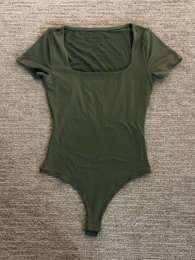 This is an Aeropostale olive green bodysuit in a women's size XS. It features a stylish square neck and short sleeves. This item has been previously worn, but it remains in good condition.
