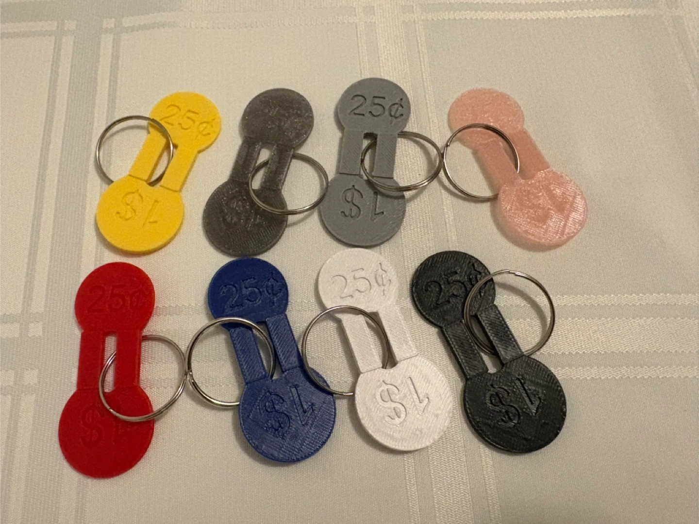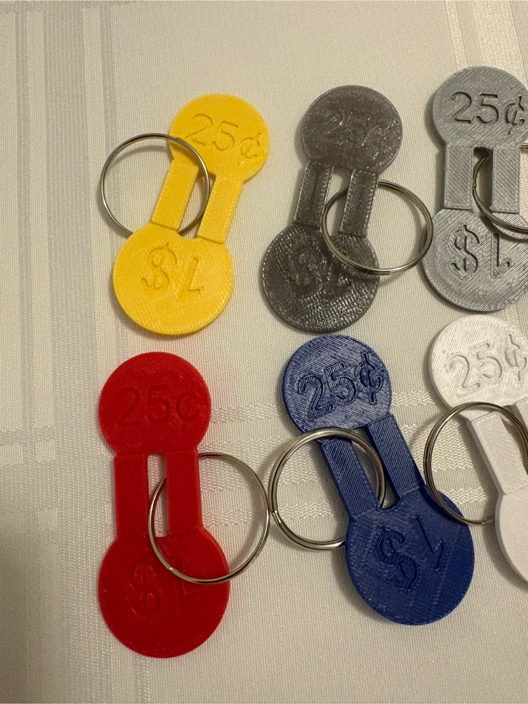 Selling these cute shopping cart coin keychains! They come in a variety of colours and are perfect for always having a quarter or loonie handy for the grocery store.