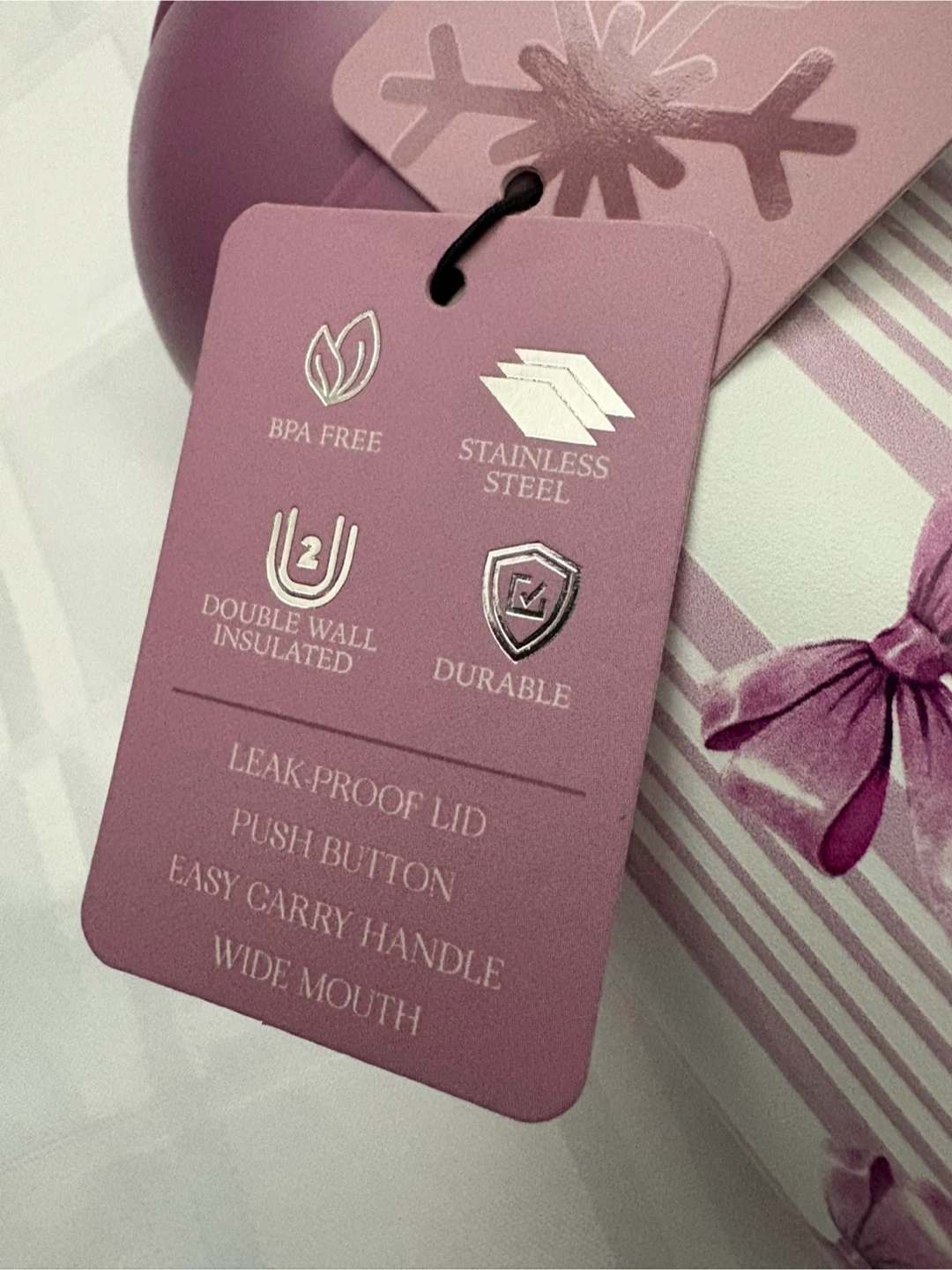 It's BPA free, durable, and features a leak-proof lid with a push button and wide mouth. The bottle has a cute design with pink stripes and bows.