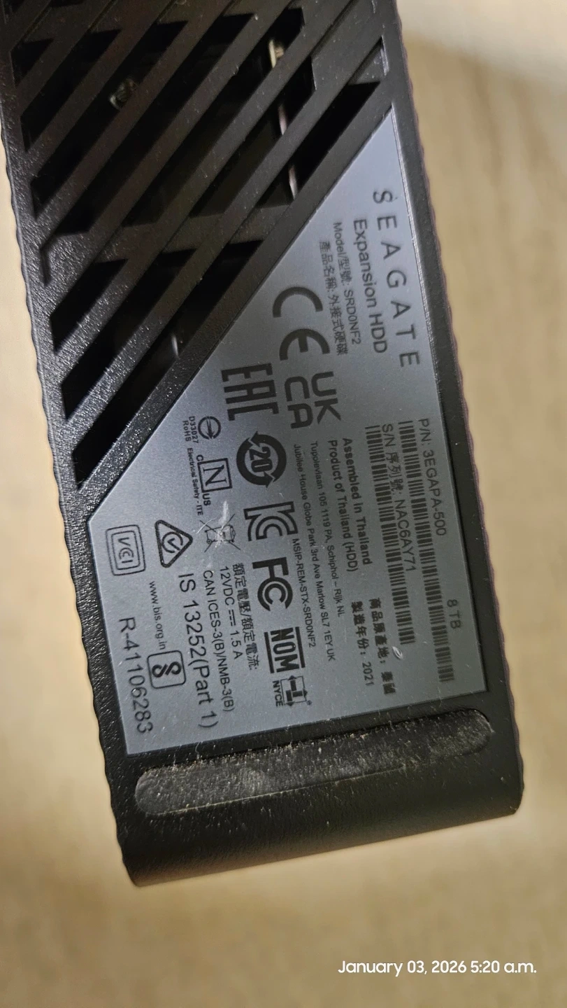 Selling a Seagate Expansion HDD with 8TB of storage. It comes with the power adapter and USB cable. Model number is SRDONF2. It was assembled in Thailand in 2021