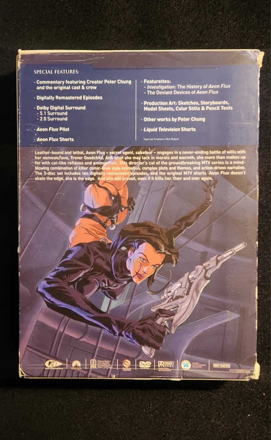 3 Disc set Aeon Flux, the sexy secret agent extraordinaire that took MTV by storm is back on DVD! Follow the deftly skilled Aeon on her adventures through a futuristic world brimming with chaos and corruption. Experience every gripping episode of this cutting edge animated series like never before, as each episode has been digitally restored and has been bolstered with a 5.1 Dolby Digital Surround Sound audio track. Every aspect in the creation of The Complete Aeon Flux has been overseen and endorsed by original creator Peter Chung making this the definitive Aeon Flux collection. Check out my other ads!