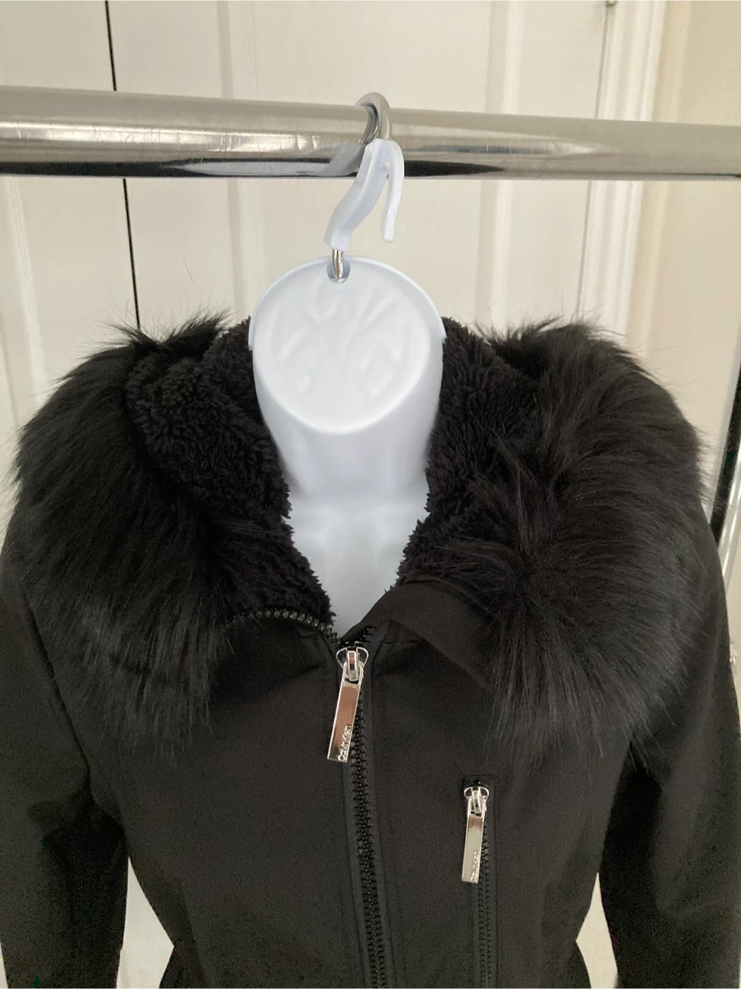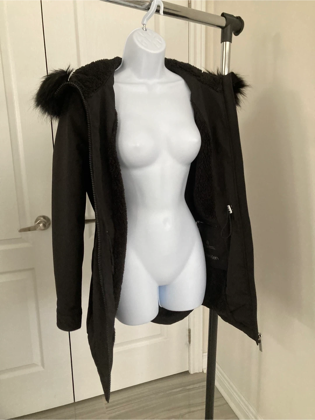 A super stylish Calvin Klein winter jacket in size XS. It's black and features a detachable fur trim. It's designed to repel water, breathe, and stretch for ultimate comfort! Perfect for the Canadian winter!