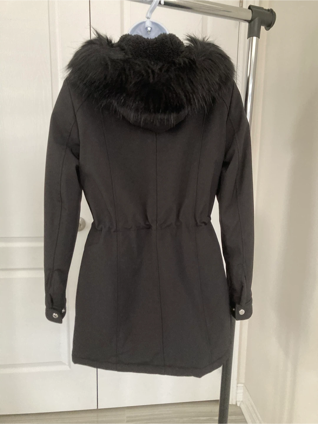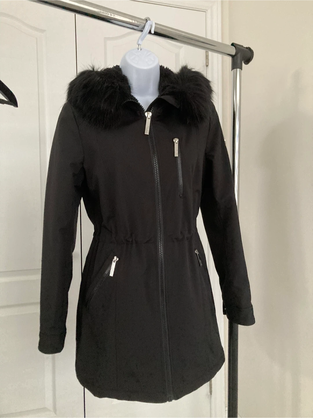 A super stylish Calvin Klein winter jacket in size XS. It's black and features a detachable fur trim. It's designed to repel water, breathe, and stretch for ultimate comfort! Perfect for the Canadian winter!