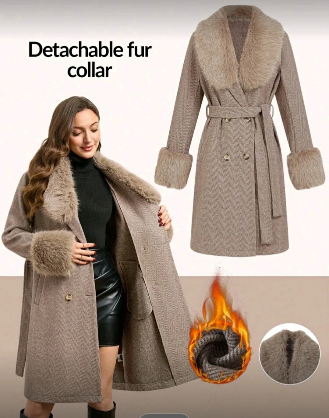 Here's a stylish coat with a detachable fur collar! It has a belted waist.