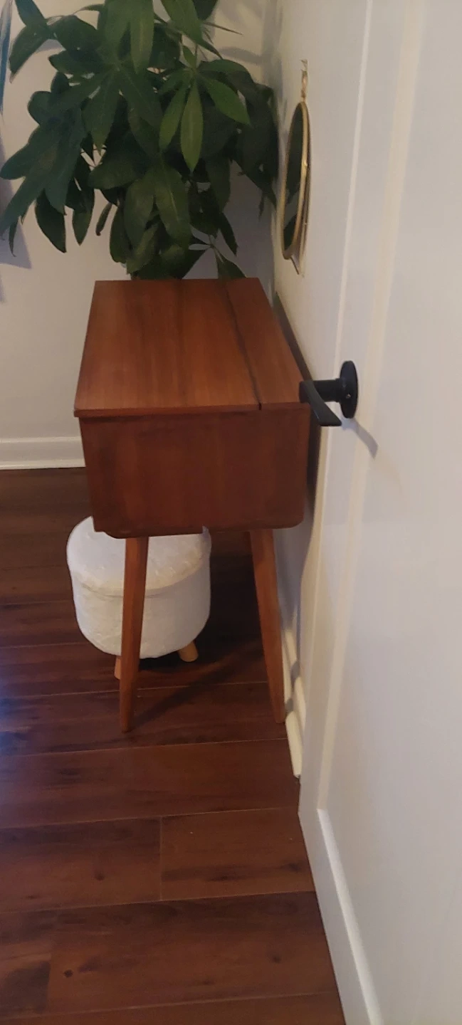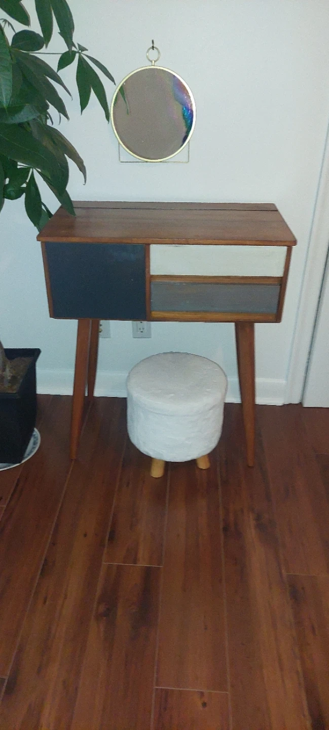 Selling a charming mid-century modern vanity table, perfect for adding a touch of retro style to your space! It comes with a matching stool. The vanity features a wooden top, painted drawers, and sleek tapered legs. It's in great condition and ready to use!