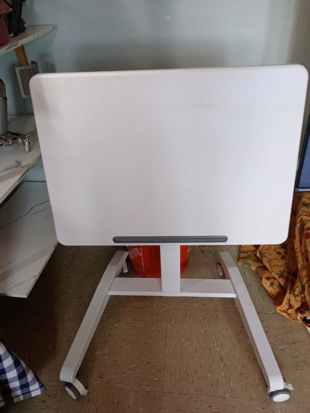 Selling a handy white rolling desk with adjustable height. It's perfect for small spaces or as a mobile workstation. Easy to move around and adjust to your preferred height for comfortable use