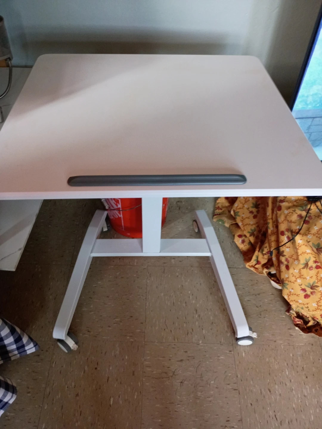 Selling a handy white rolling desk with adjustable height. It's perfect for small spaces or as a mobile workstation. Easy to move around and adjust to your preferred height for comfortable use