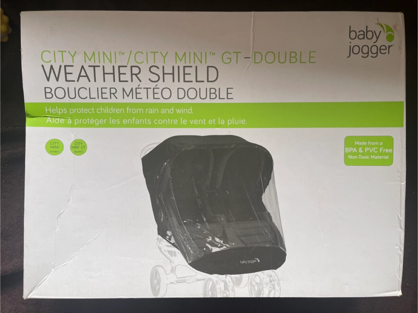 Weather Shield: Official Baby Jogger rain/wind cover (fits both Standard and GT double models). Comes with original box.