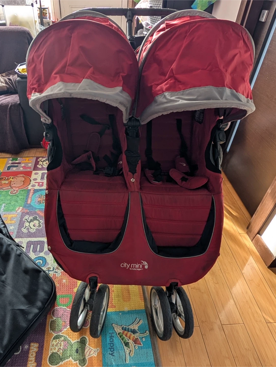 Baby Jogger City Mini Double Stroller: Red/Gray standard model. Fits through standard doorways and has the famous "quick fold" technology. Good used condition.