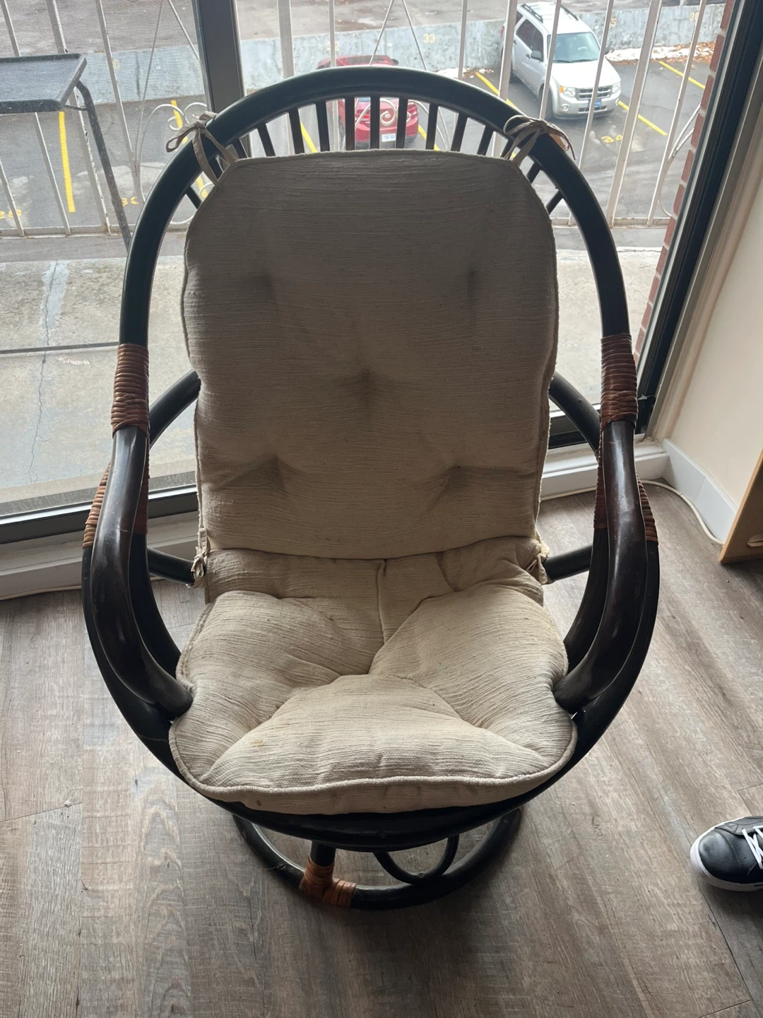 Selling a vintage wicker swivel cochair with a comfy cushion! The chair is in good condition and would be a great addition to any room. It's perfect for relaxing and unwinding after a long day