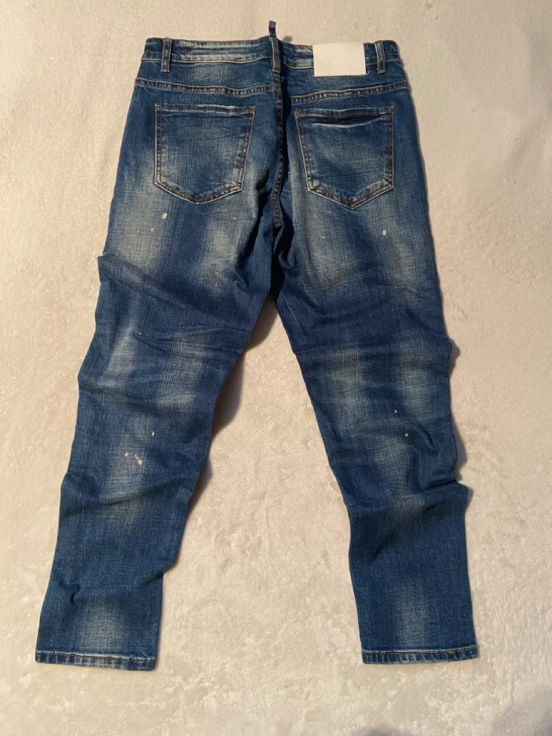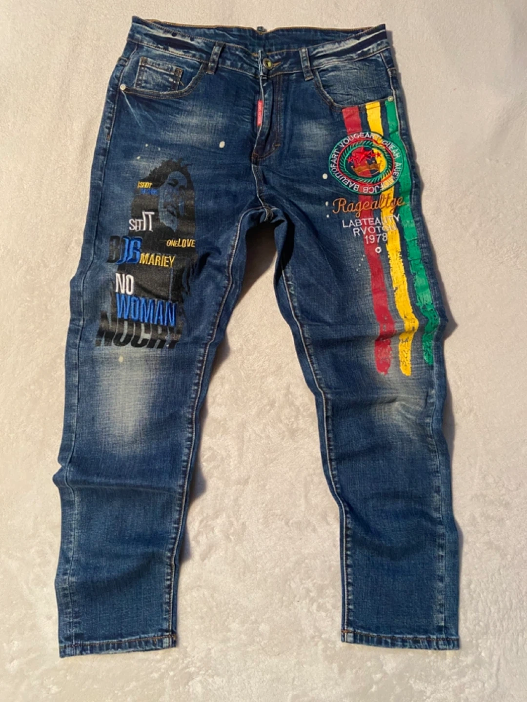 Selling a pair of jeans in a distressed denim style. They feature unique graphics and a cool, worn look. Perfect for adding some edge to your wardrobe!