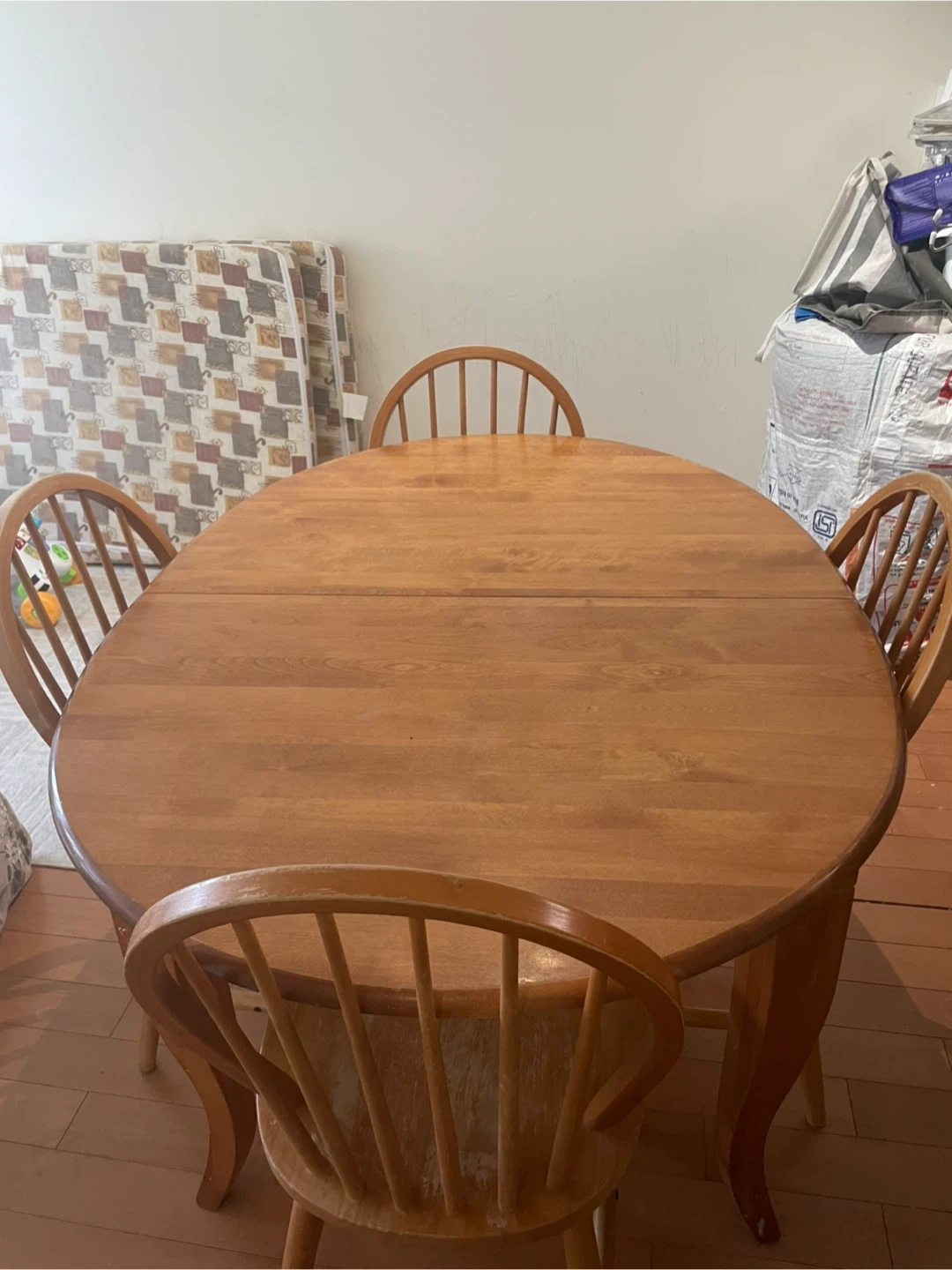 Selling a lovely wooden dining table complete with four matching chairs! It's in great condition and ready to be the heart of your dining space. Perfect for family dinners or cozy get-togethers