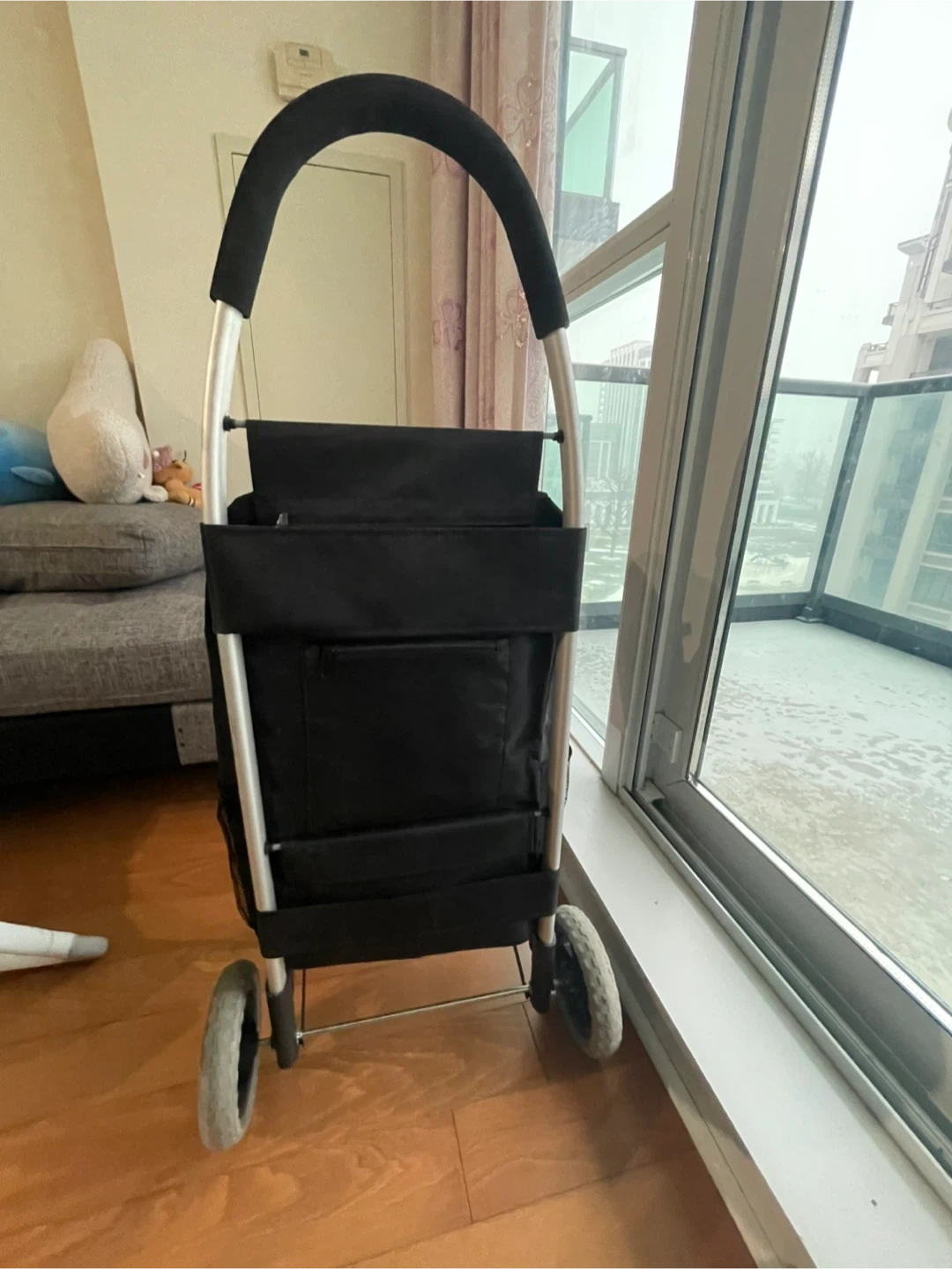 Selling a black shopping cart with wheels. It's in good condition and ready to help you with your grocery runs or trips to the market! It's lightweight and easy to maneuver, making shopping a breeze