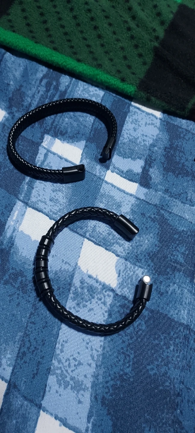 Selling a set of two black braided leather bracelets. They have a sleek and stylish look, perfect for everyday wear. The bracelets feature a magnetic clasp for easy closure. They are in good condition and ready for a new owner!