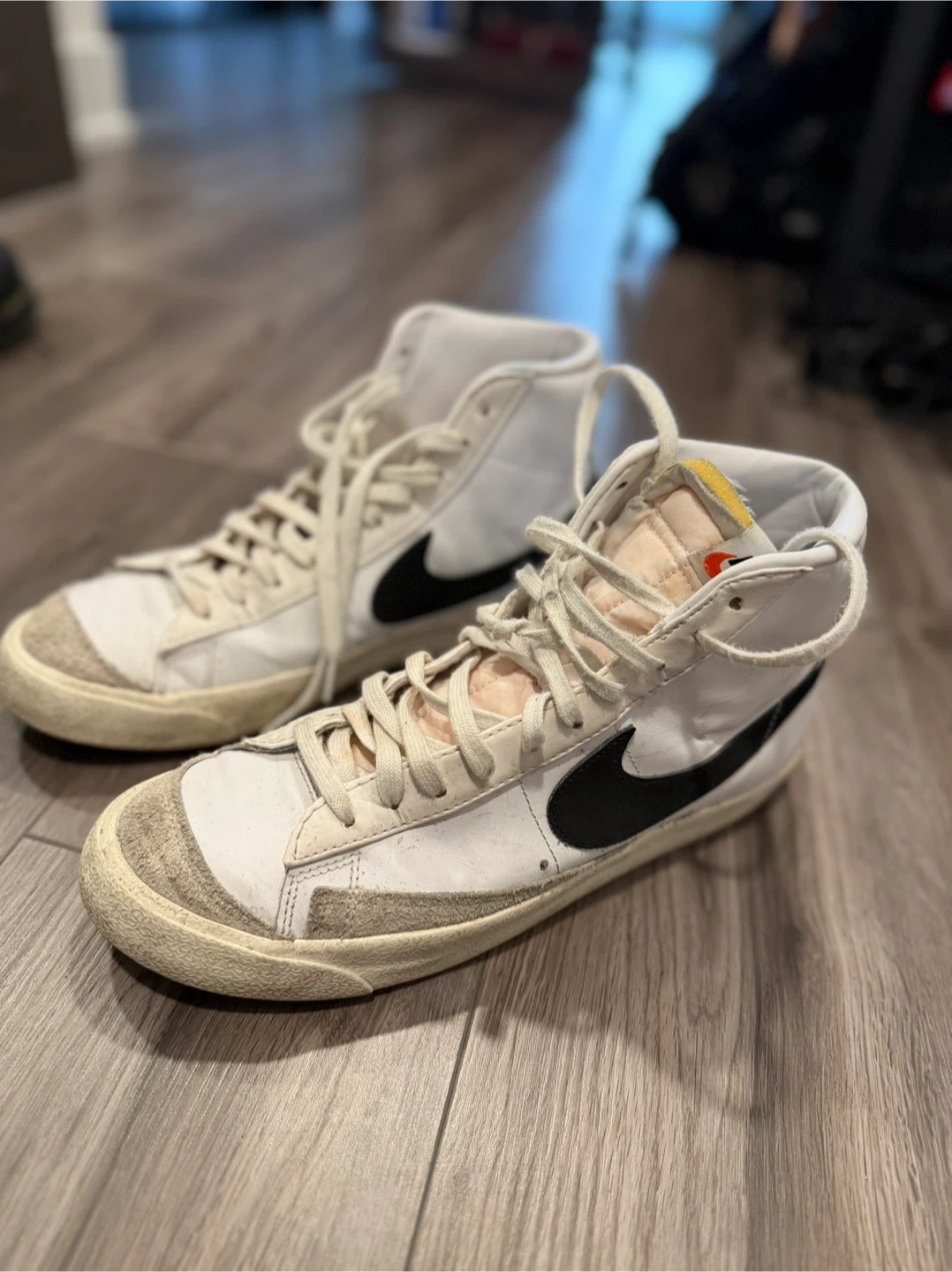 Selling a pair of Nike Blazer Mid '77 Vintage sneakers in a white and black colourway. These classic high-tops have a retro look that's always in style. They are in used condition.