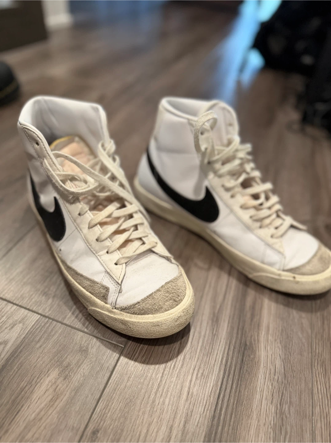 Selling a pair of Nike Blazer Mid '77 Vintage sneakers in a white and black colourway. These classic high-tops have a retro look that's always in style. They are in used condition.