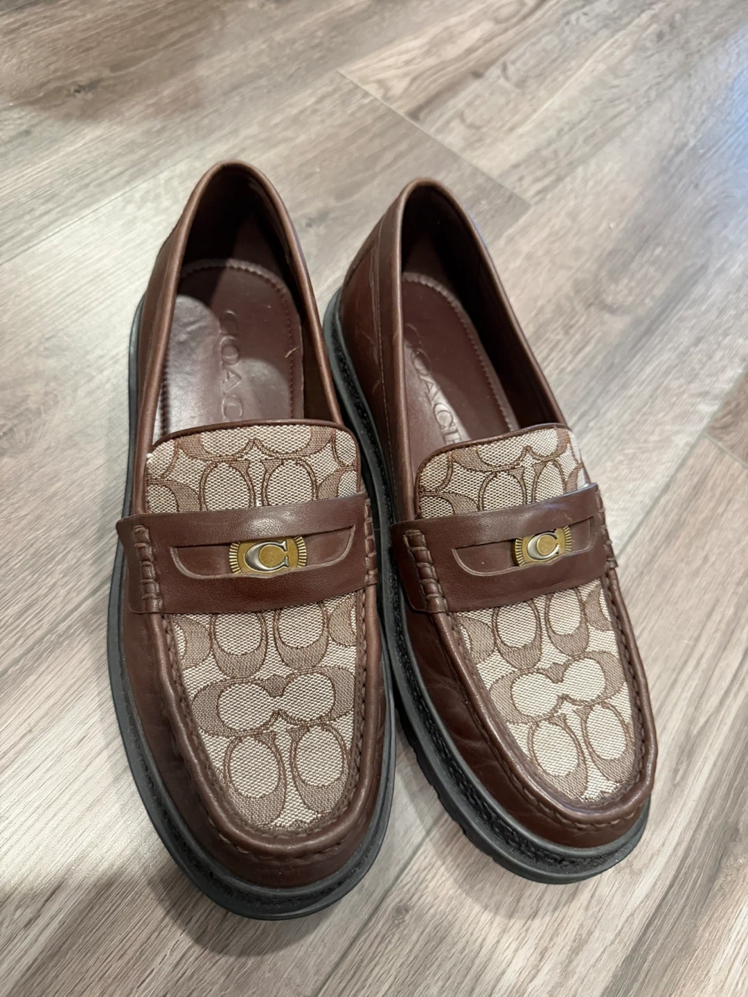 These are a pair of brown leather loafers from Coach. They feature the Coach logo pattern on the front. They appear to be in great condition!