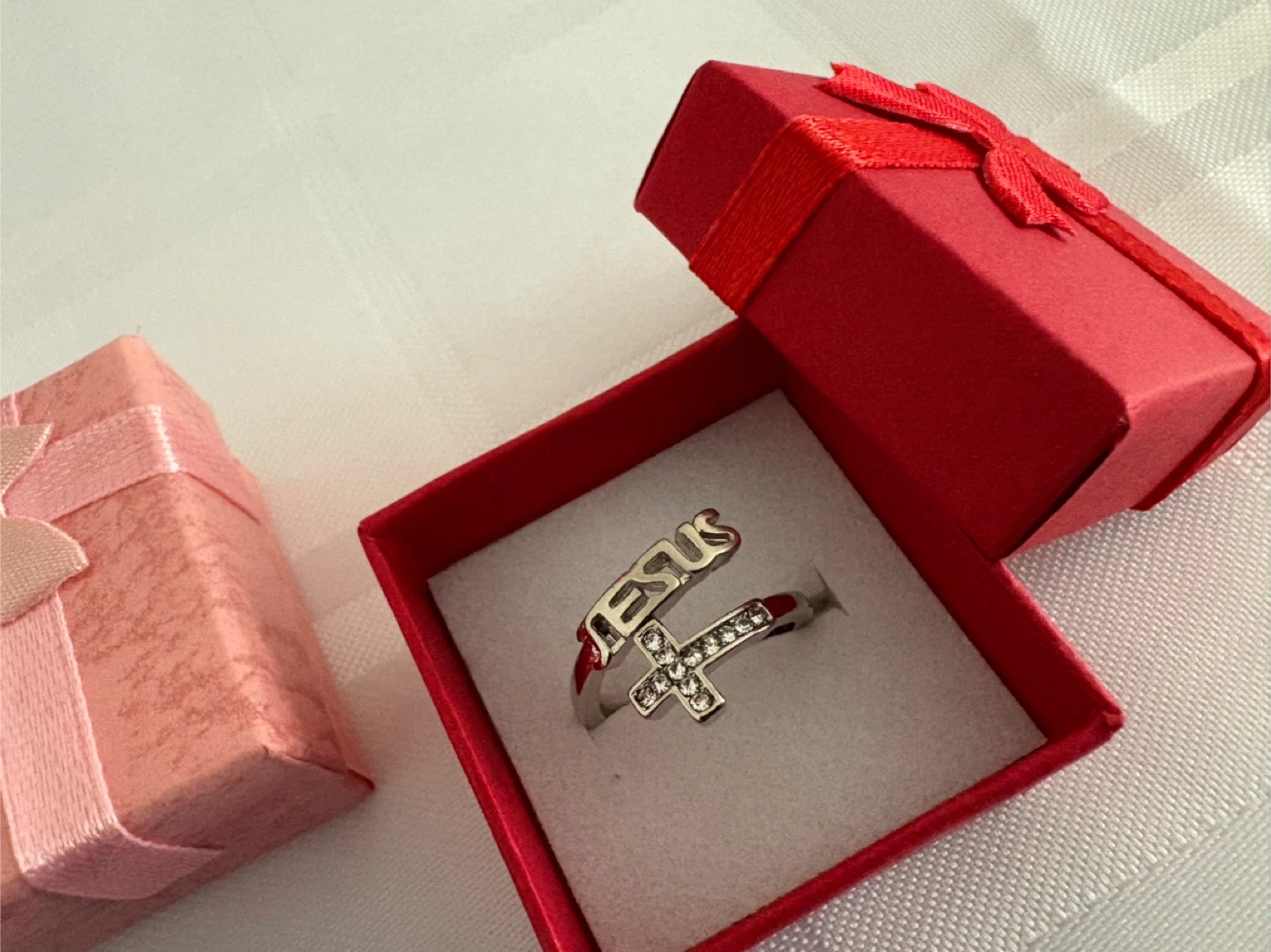 Here's an adjustable silver ring with a cross and the name 'Jesus' on it. It comes in a cute little gift box!