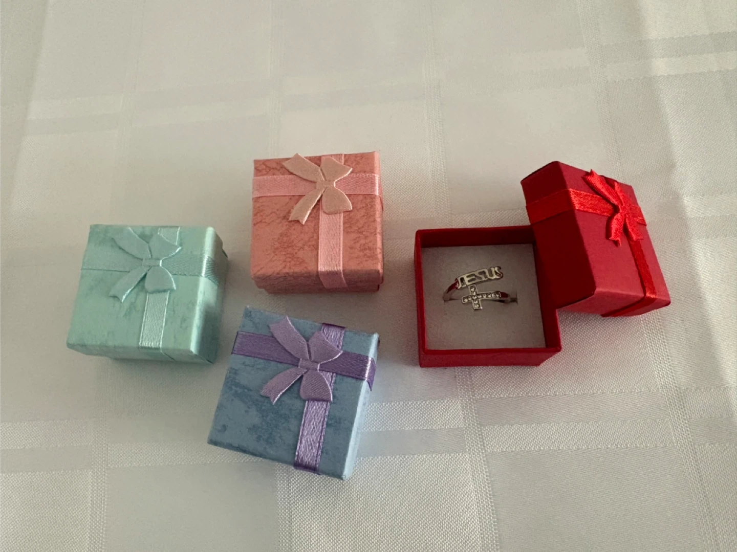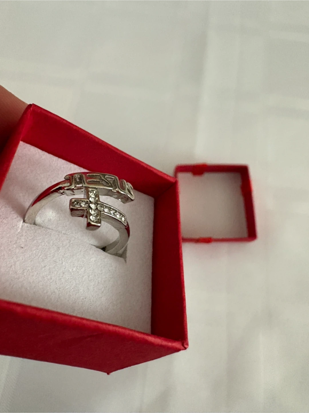 Here's an adjustable silver ring with a cross and the name 'Jesus' on it. It comes in a cute little gift box!
