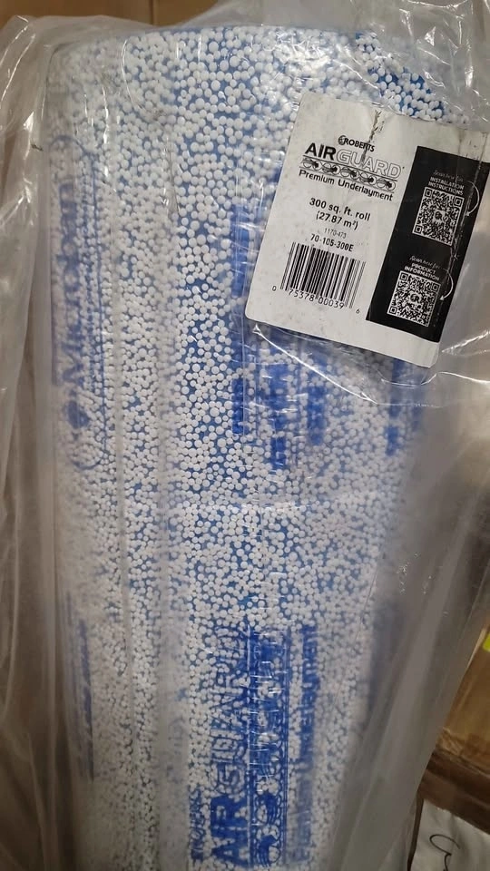 ROBERTS AirGuard Premium Underlayment is ideal for use under laminate and engineered wood flooring. It features an innovative AirFlow Technology that releases trapped moisture as a vapor to prevent damage to floors and subfloors. Its 3-layer design protects laminate and engineered hardwood flooring: The top layer is made of an impermeable film that keeps moisture away from flooring; the middle layer consists of thousands of cushioning, stabilizing polyshims that support the finished flooring; and the bottom layer is a permeable film that wicks moisture up from concrete or wood subfloors. Feel free to message if you have any questions!