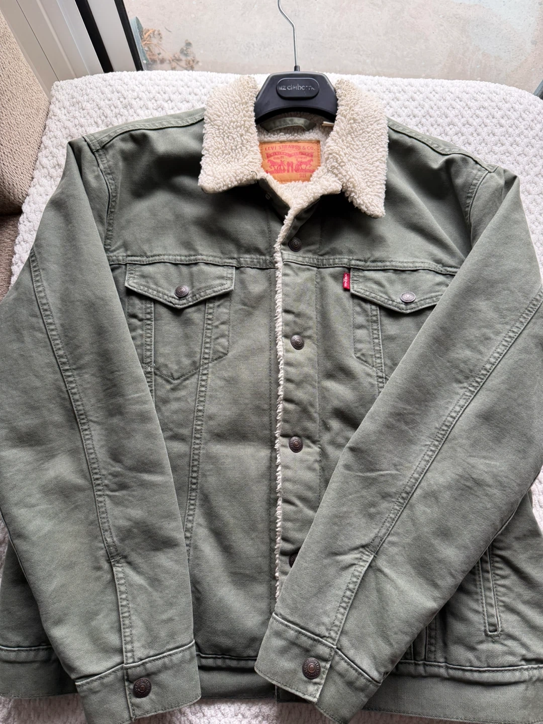 Here's a Levi's Sherpa Trucker Jacket in a nice sage green! It’s a classic piece that’s both stylish and warm, perfect for layering during cooler weather. The sherpa collar adds a cozy touch, and it’s in great condition. A great addition to any wardrobe!