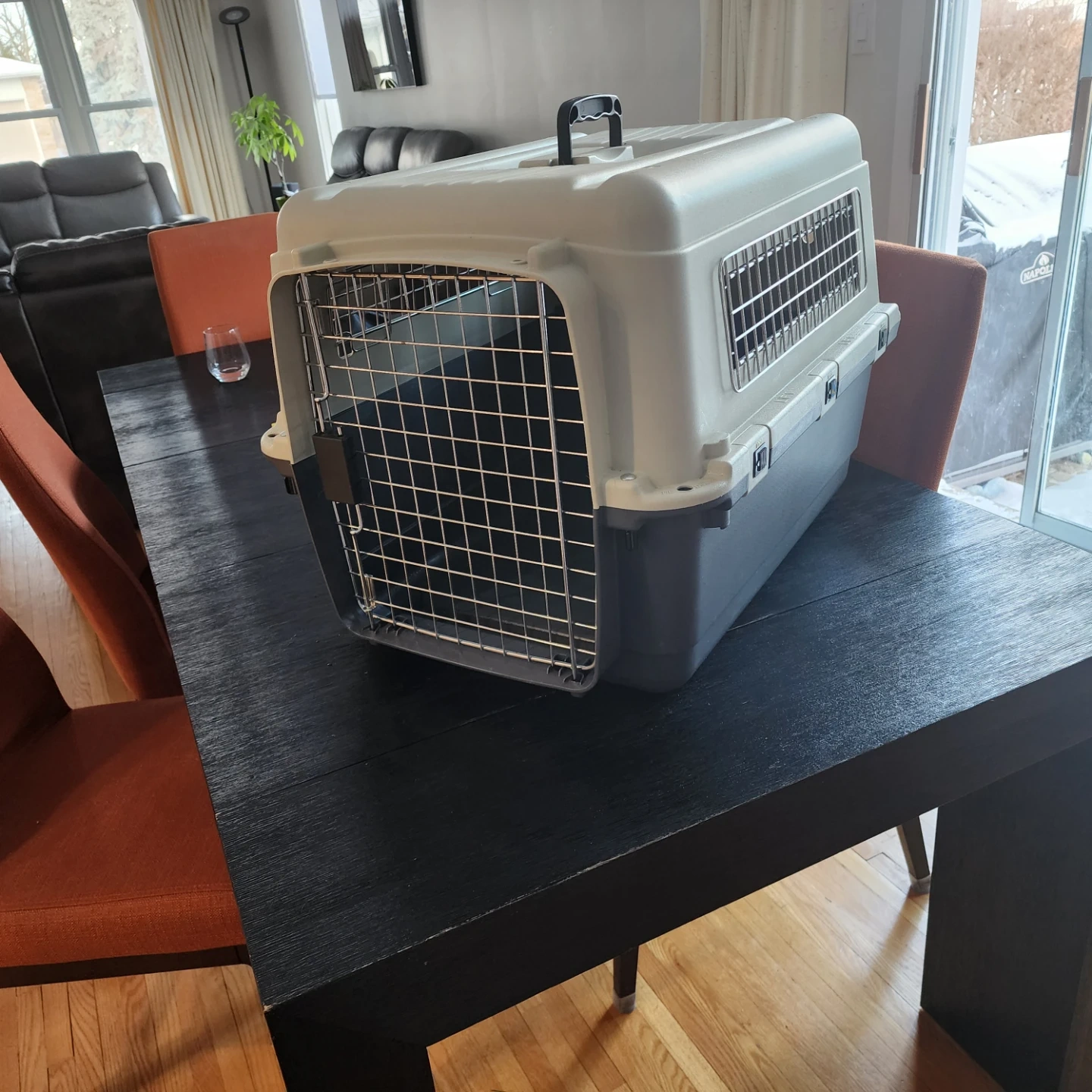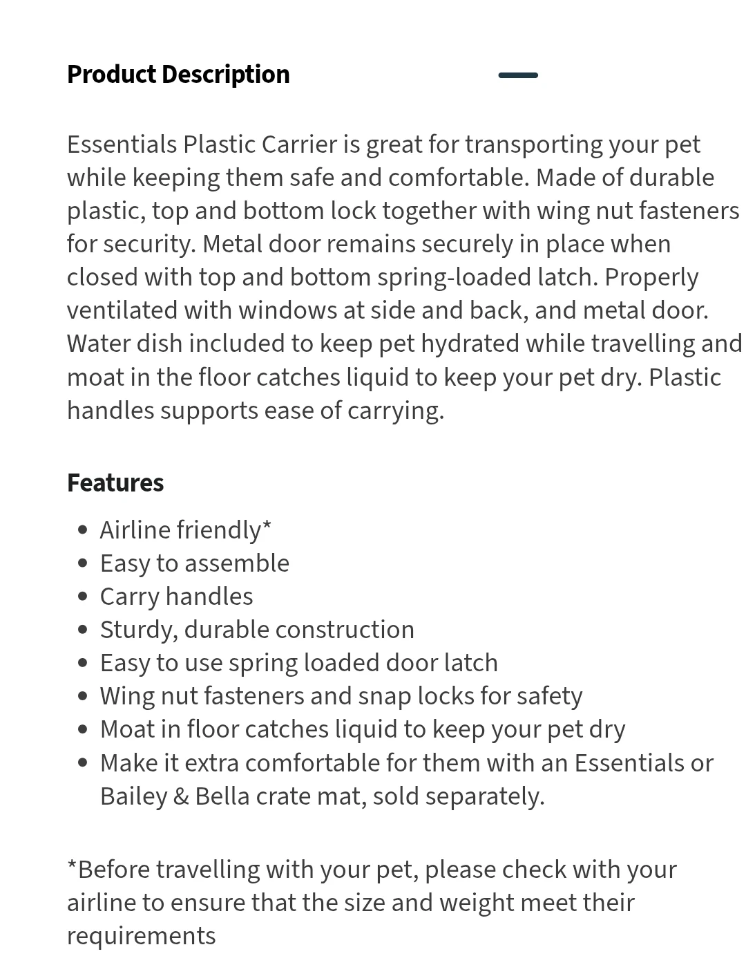 Essentials plastic pet carrier is great for transporting your pet while keeping them safe and comfortable. It is made of durable plastic, top and bottom lock together with wing nut fasteners for security. Metal door remains securely in place when closed with top and bottom spring-loaded latch. Properly ventilated with windows at side and back, and metal door. Plastic handles supports ease of carrying