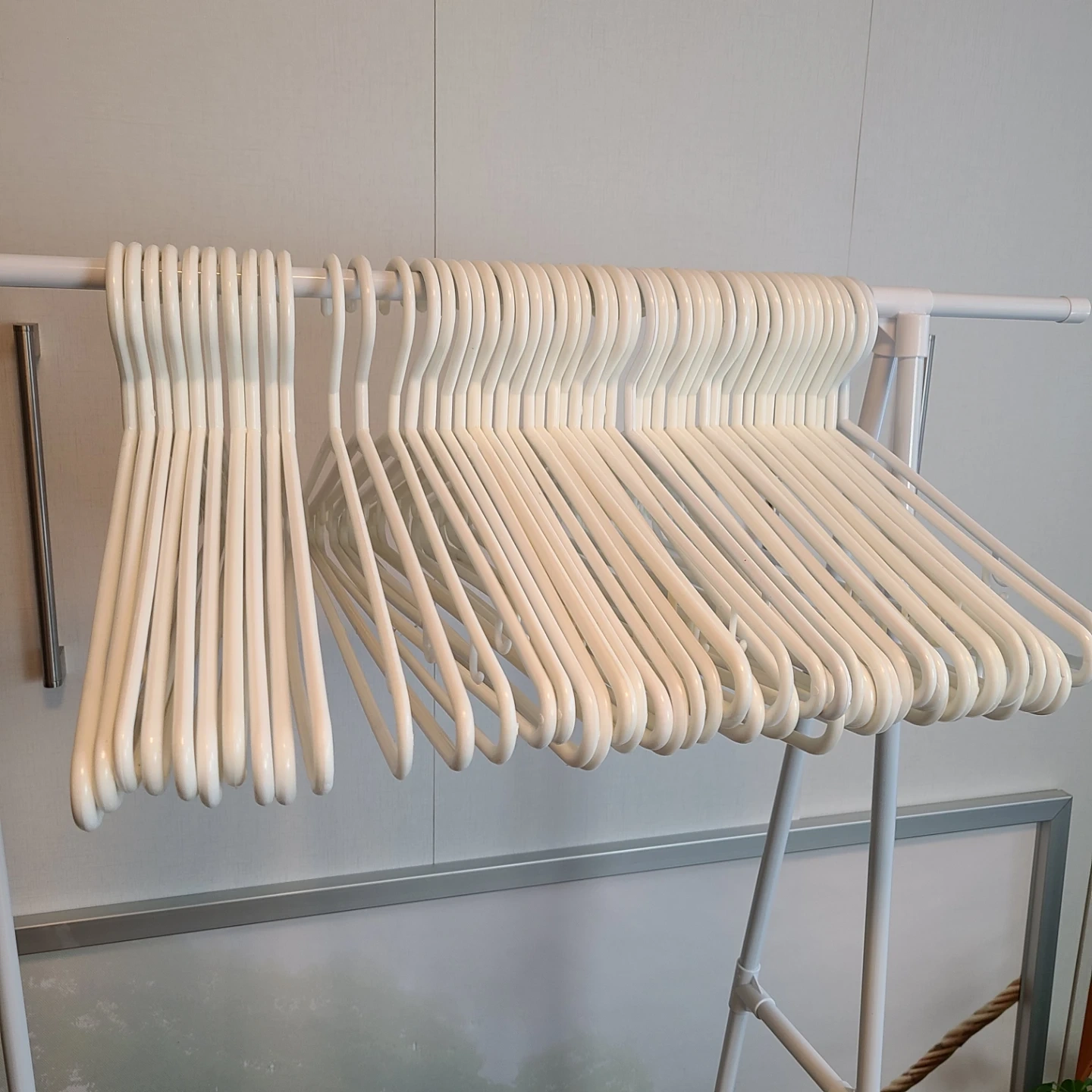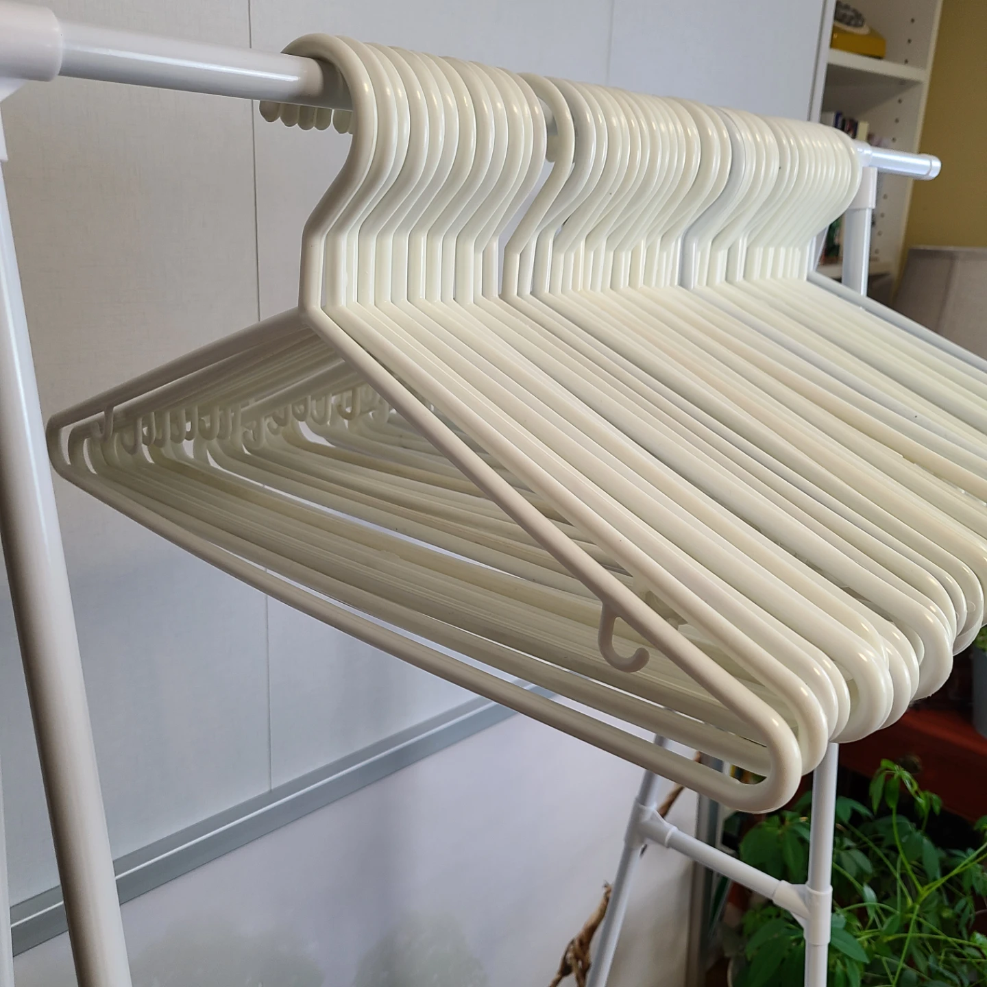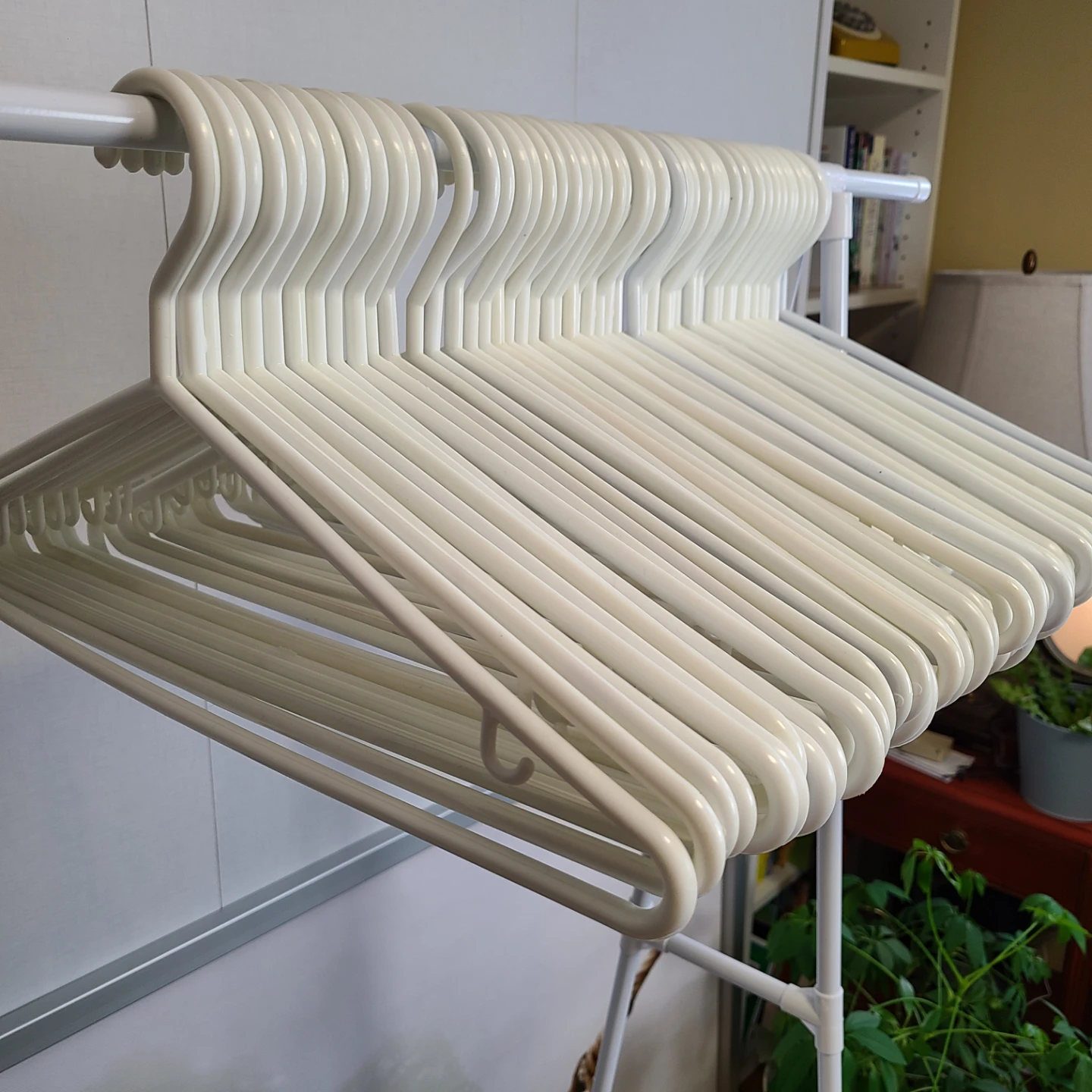 Selling 60 white plastic adult clothes hangers. They're in great shape and ready to help organize your closet!