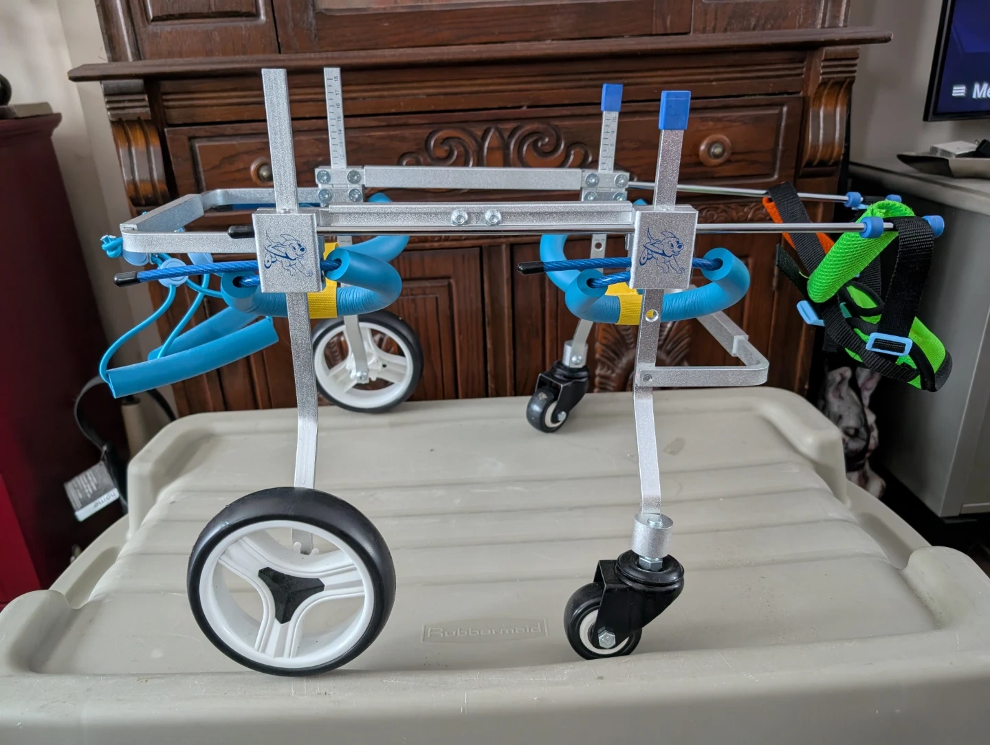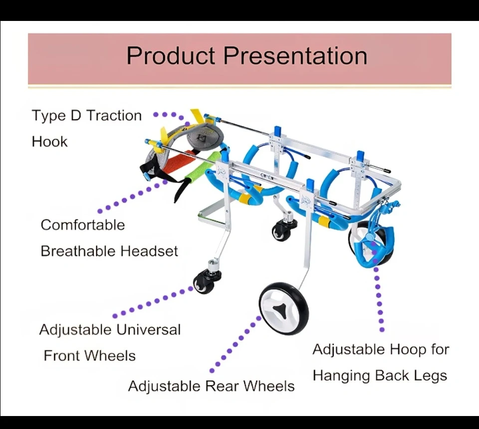 This adjustable pet wheelchair is designed to help dogs and cats with mobility issues. It features: