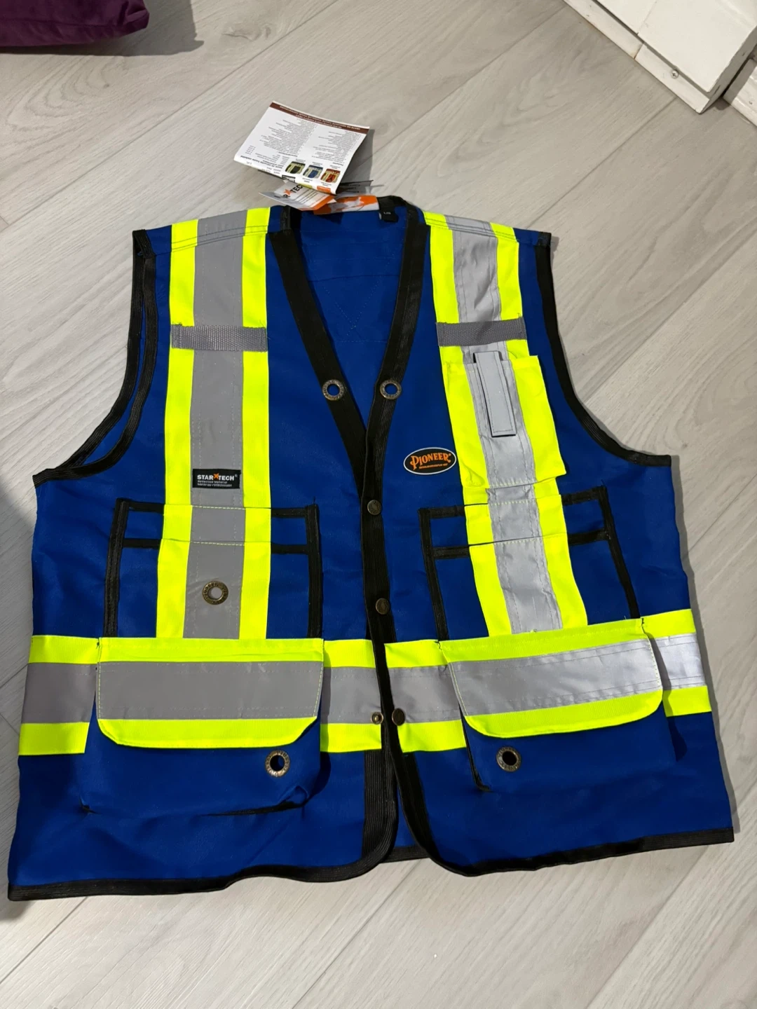 Selling a Pioneer safety vest in blue and yellow. It has reflective stripes and multiple pockets. Perfect for construction or other work environments where visibility is key!